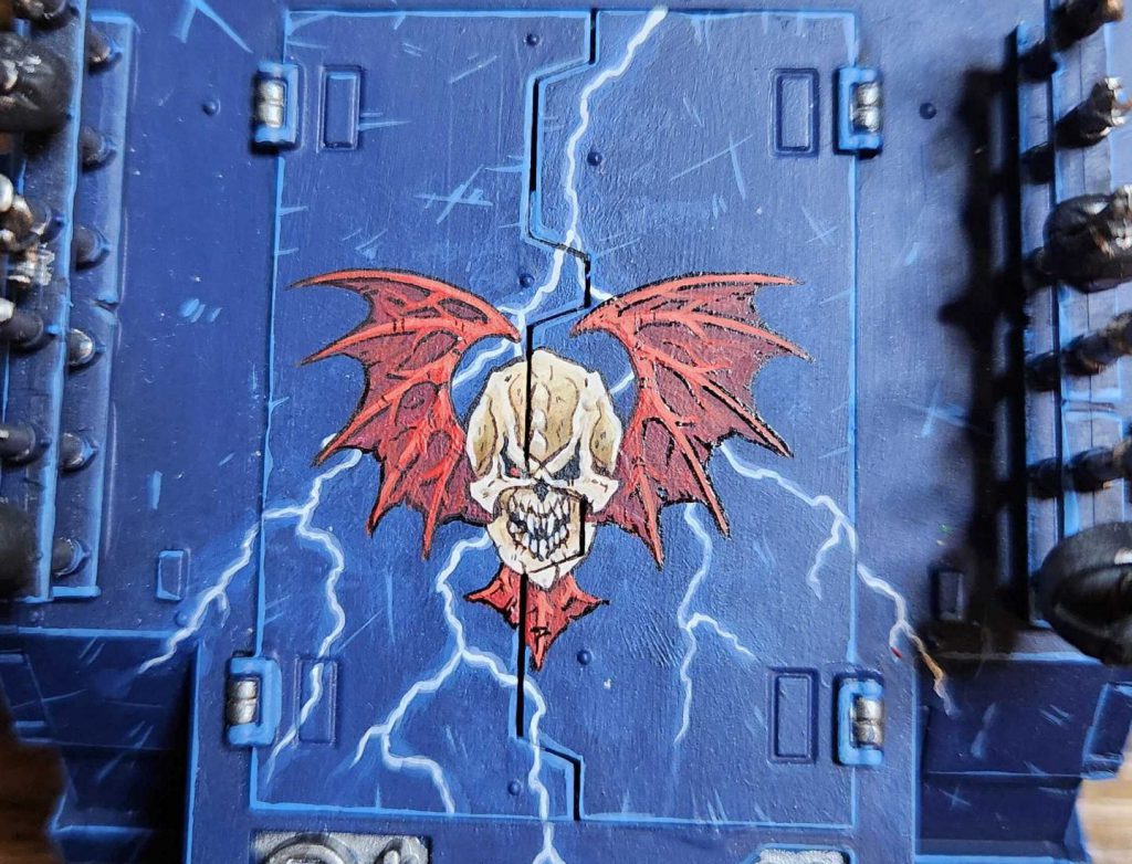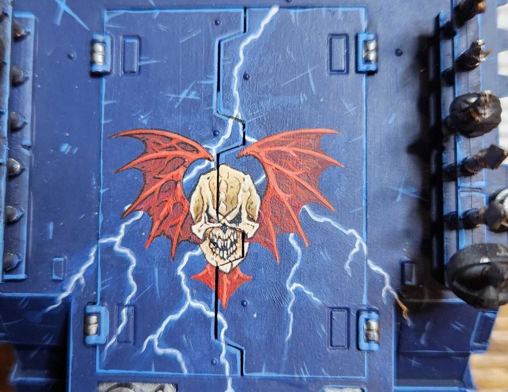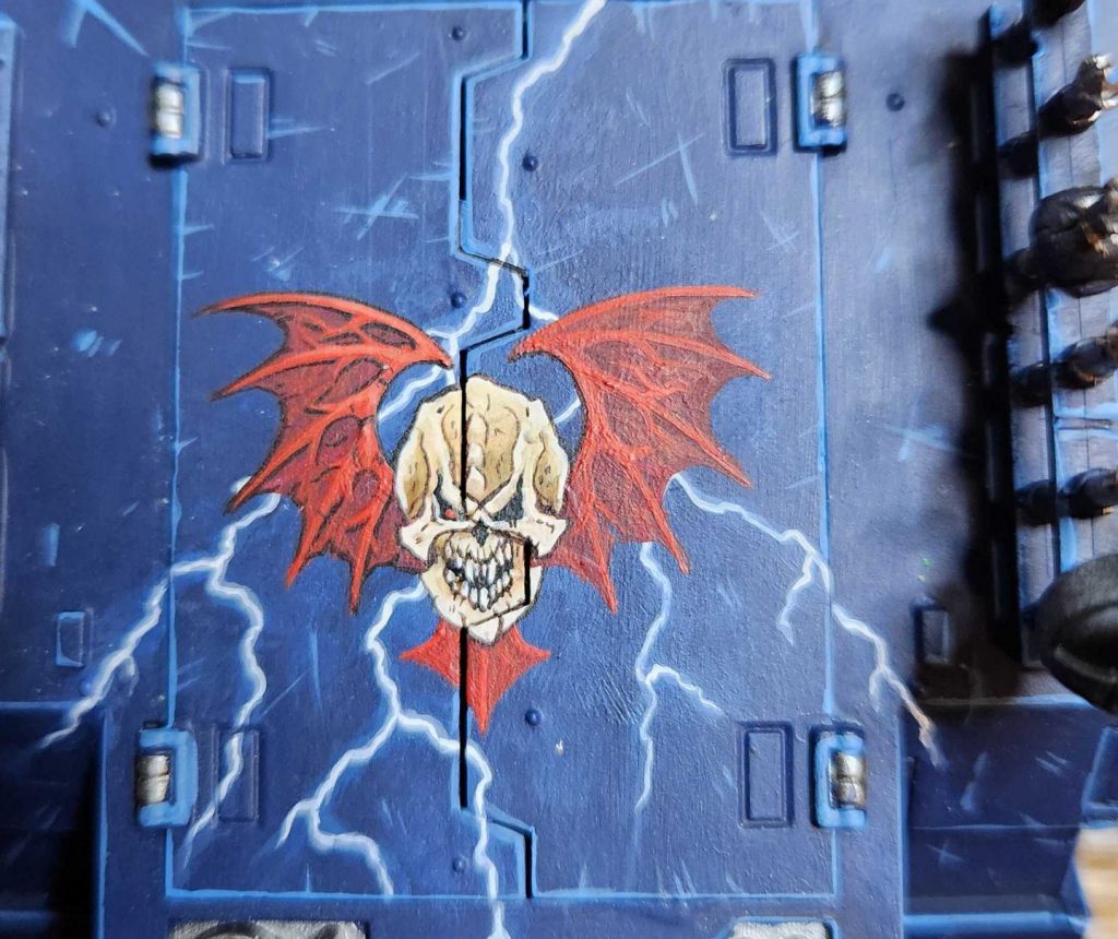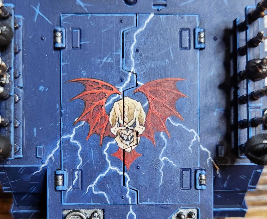 The principle is the same here, laying down the blue highlights and lightning bolts, then coming back over it to lay down the wings, then the skull.