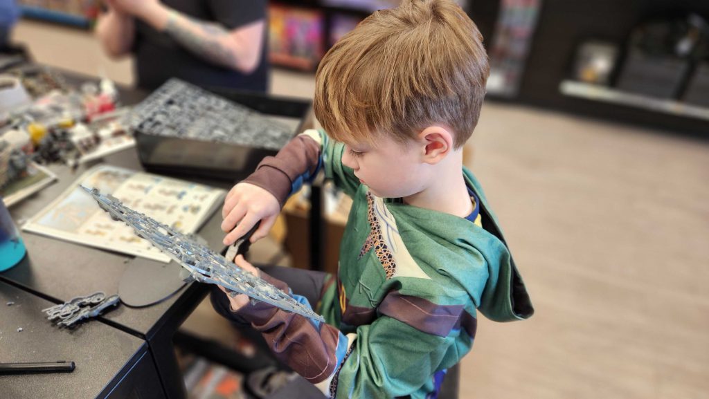 Bryce cutting bits of knight off the sprue.I worked with him on Friday to start and on Saturday he worked with Max to get more of the model done. Our plan right now is to assemble the frame, then prime it and the armor plates separate, so we can do the frame in Leadbelcher and the plates in Retributor Armour, matching it to the gold of his King Warrior space marines.