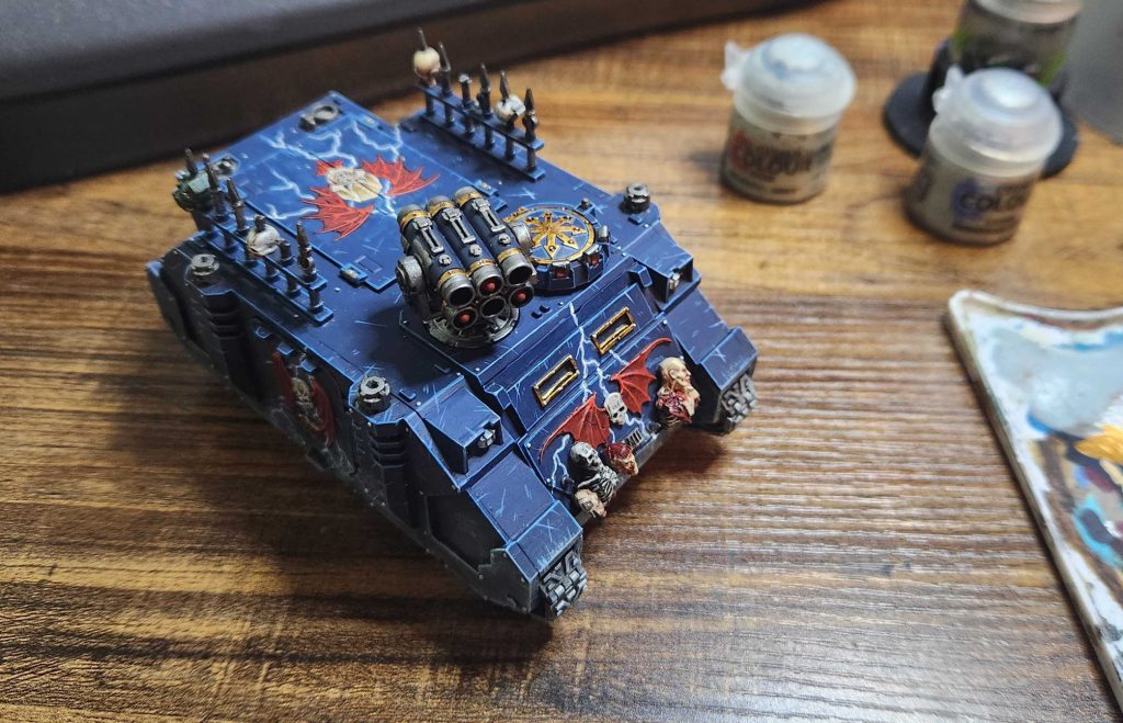The reason I hadn't finished this guy yet is mostly that I don't lie the Heresy-era Forge World legion kits nearly as much as the classic chaos ones, and so when it came time to pick two Rhinos to paint, this one lost out. That's also why it has a different door legion icon on top - rather than paint the sideways skull of the Crimson Wing, I went with the classic Wayne England Night Lords logo.