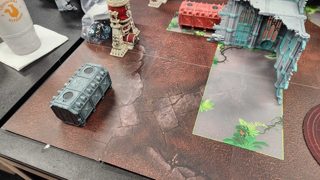 My plan on turn 1 is to use the Nurglings to move block Ryan's Goliath full of Acolytes - most games I'm using them to move block something important or costly, ideally using the table edge to prevent it from moving around them. Goliaths are pretty wide, and it's easy to use the terrain and the wall there to stop it from moving more than 8" out from Ryan's Deployment Zone. Going first however I can advance the Nurglings up and put them right in its face. They won't charge, but they'll gladly sit there and eat a turn of combat to prevent it from taking part in the battle for a round.