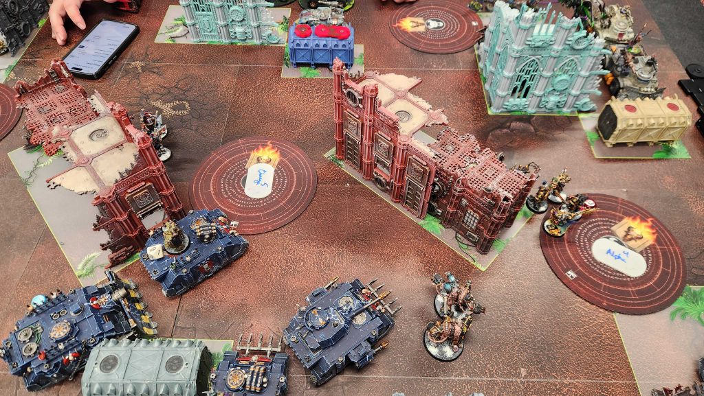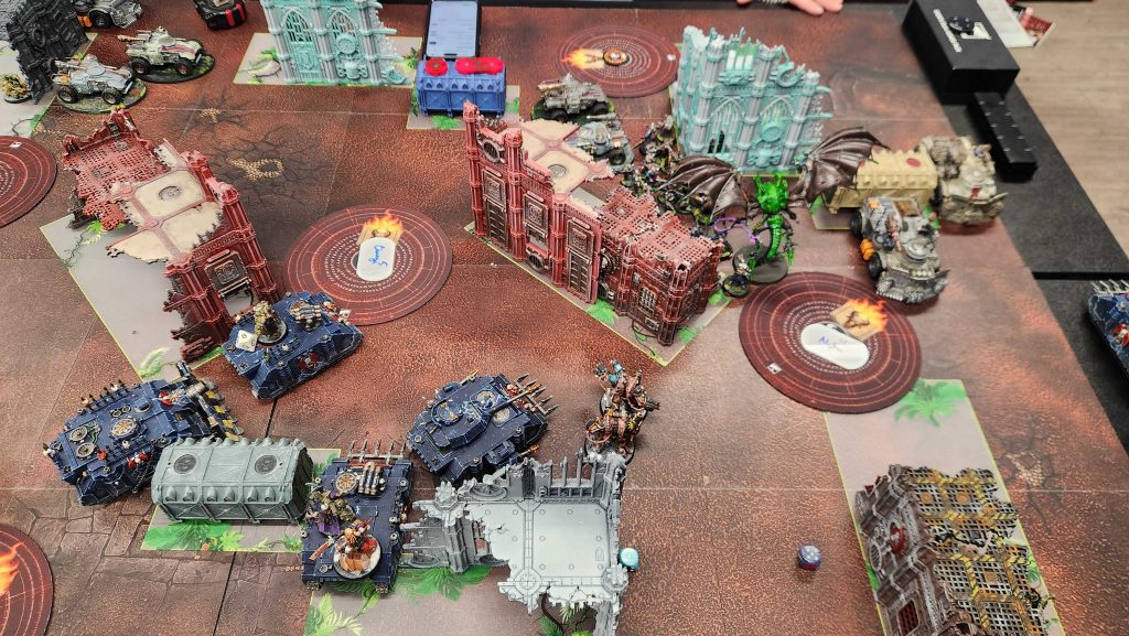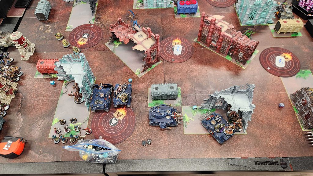 On Ryan's turn he's not shy about bringing the pain and throws the Hive Tyrant and a massive blob of acolytes toward the alpha objective. This is kind of ideal, as him overcommitting here means he's not putting things elsewhere, and he's too afraid of my Obliterators to bring his vehicles up the table into them. RIP Bile and his crew, but I like where I'm at. Ryan drew Bring it Down and Area Denial, and he was able to completely tear up my Predator on a single volley of mining lasers. Ryan was generally dicing me pretty hard most of this game - I failed most of my pacts and he was on fire with his shot rolls, so every point I scored here was an uphill battle.