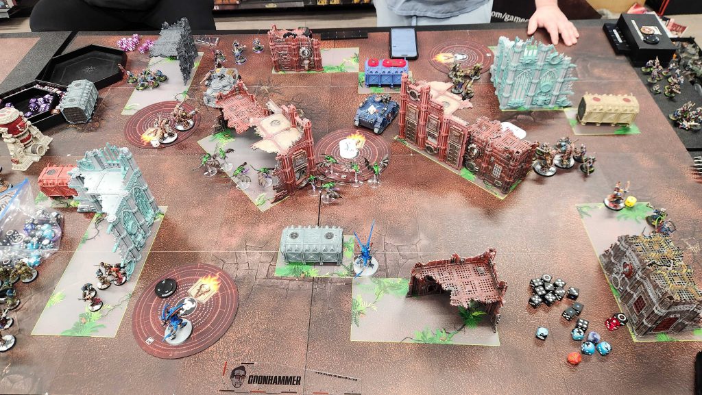 The upside is that, while Kevin brought in Titus and his squad plus some Incursors to get in my way up top, I've managed to screen him out of my DZ all game. Where Kevin gets lucky is that this never matters - despite losing his Scouts turn 1 and having screened-out units in reserves, he never draws any secondaries that would punish him for it - none of Establish Locus, Engage, Behind Enemy Lines, Recover Assets, or Sabotage. This makes for a brutal uphill battle late in the game.