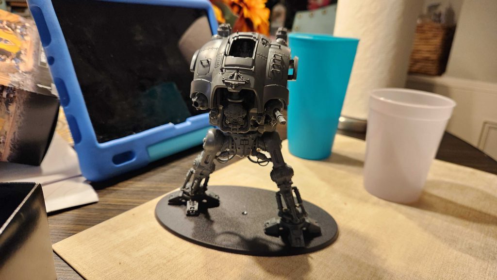 The other big piece of hobby progress was helping my son build his knight. Last time around he asked for a knight for his army and his bingo card has "centrepiece model" on it, so I said "sure, why not" and bought him one. He initially wanted to assemble it as a preceptor with chainsword but I told him that Canis Rex could pick things up with his fist and throw them and from there he was sold on it.