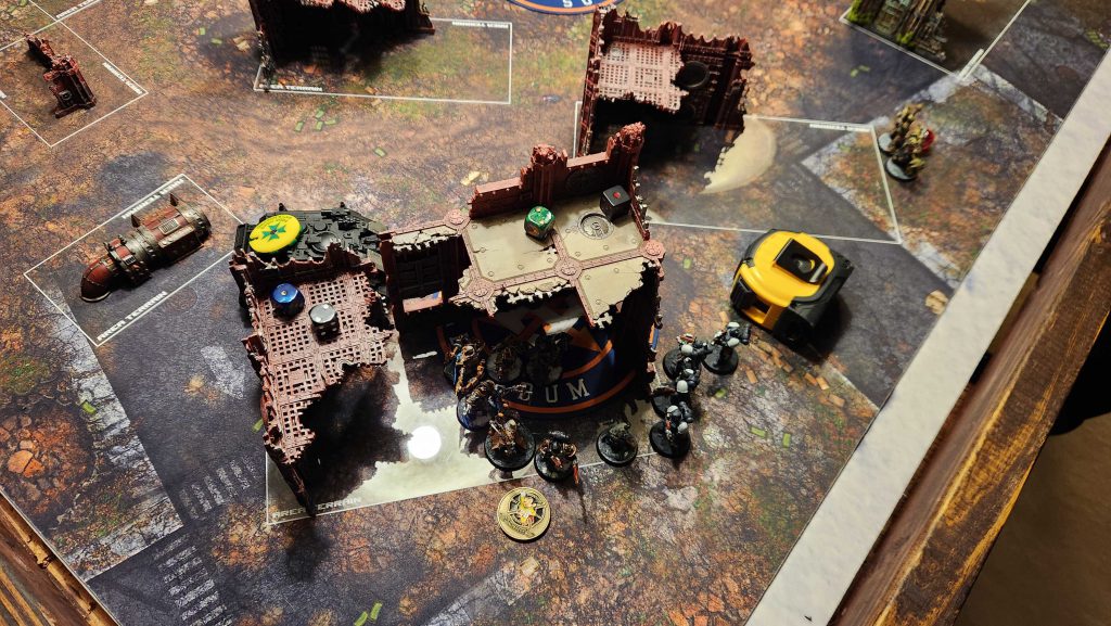 I fight my way through his reinforcements and manage to snag his home objective late, working around his other Vindicator to stay behind the wall and out of sight with Bile and his unit. I can snag an easy 6 for Containment on round 3 which helps put me up, and I get a massive break when my Vindicator unloads on Guilliman at mid-table, kills him, and then KC fails the roll for Guilliman to stand back up. I had a back-up plan for this ready - mostly charging in with the two Obliterators - but they'd have likely died to Guilliman fighting on death, making the whole thing much tougher. As it is, the Vindicator gets another turn of shooting, trading shots with KC's before it's brought down by a 1-wound Vindicator sporting Oaths re-rolls.
