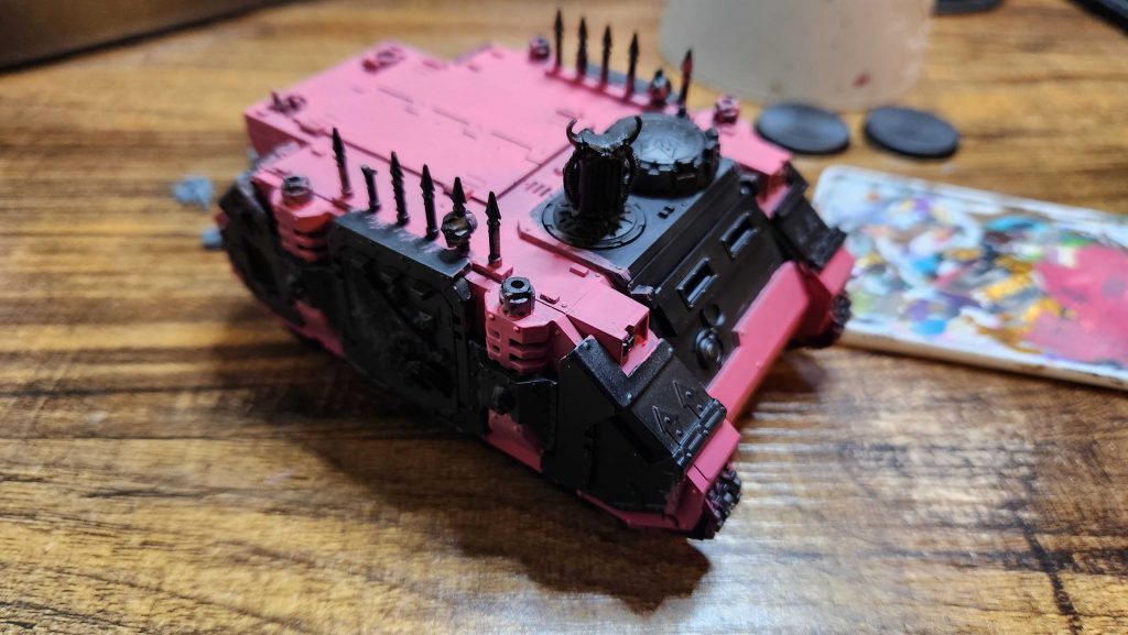 The big challenge here is just figuring out how much black I want on the final piece and which pieces will be black vs. pink. My general scheme take is that black trim meets pink armor, while gold or pink trim meets black armor; I seldom do gold on pink. I want to keep that here and I think the above shot has the correct setup, though that visor for the front windows will probably end up pink. How that I have the base layer of Pink Horror down I'll start doing blends up to Emperor's Children before edge highlighting with Fulgrim Pink.