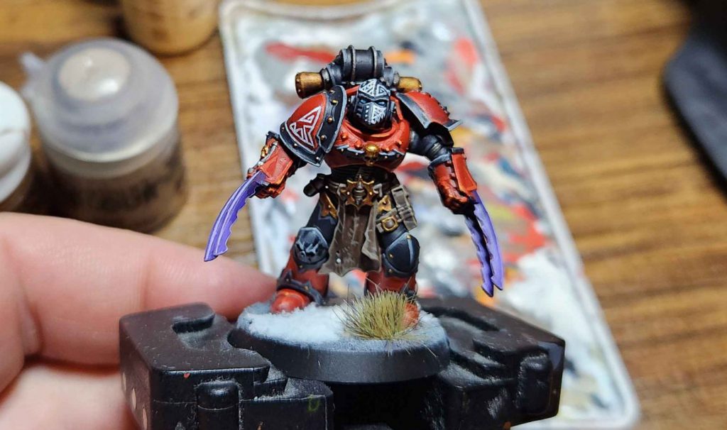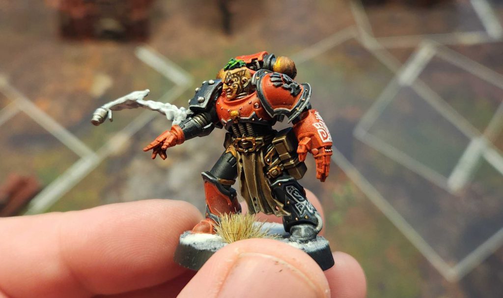 I'm not unhappy with this guy but he needs shading on the trim and hazard stripes and I need to gap fill that multi-melta and add some more highlights to his red skin. He's OK but could pop much more than he does.