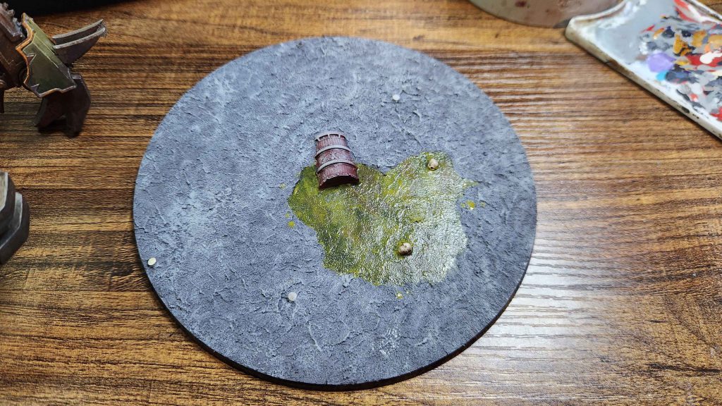 The puddle was easier than you'd think - I simply painted part of the primed base with a mix of different greens and browns - Castellan, Death World Forest, Gorthorr Brown, Ogryn Camo, and Army Painter Strong Tone - then I put a layer of PVA glue down over top of that and used it to make some ripples. It tends to dry glossy but clear, and then after that I added some Nurgle's Rot to give it some extra sickly shine. For added effect you want to have stuff look like it's floating in the goo, and that's where the barrel (taken from a Sector Imperialis Basing Kit) and some skulls cut in half do the trick.
