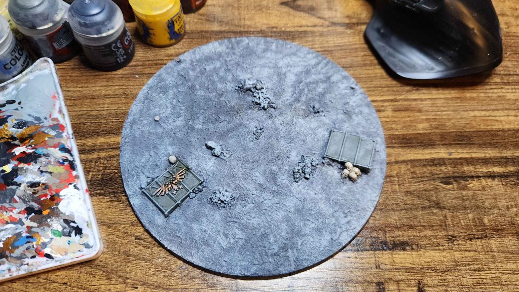 The big thing with these is that they had to be magnetized. I glued magnets on the tips of the defiler hind legs and let that dry, then I put glue on the second set of magnets whilet hey were attached and glued it to the base, letting them sit wherever was needed. Once it all dried, you just pull the model off and get to basing. Most of this is some extra stuff and Astrogranite texture paint, but I'm going to come back and add some grass tufts when I have a few minutes - the important thing was to just get bases done.