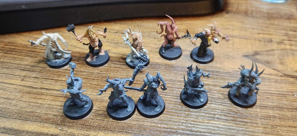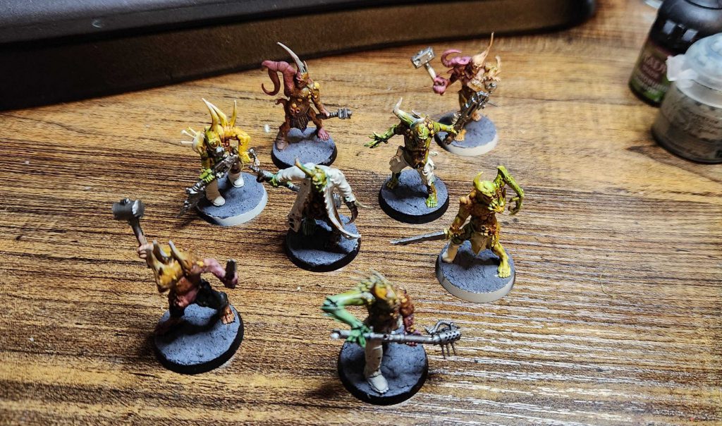 As of this writing I still have eight left to finish but they'll go pretty fast. Poxwalkers don't take a lot of time; you can get a lot of mileage out of painting them flesh colored and then using different washes and contrast paints over that to create interesting new skin tones. Purple wash on Kislev Flesh gets you some particularly interesting results.