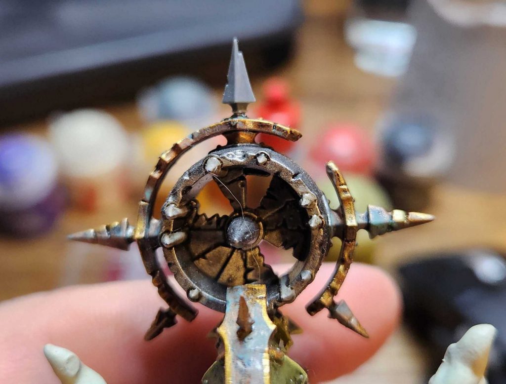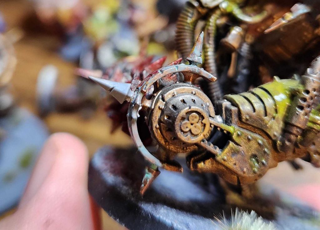 Once that's done I just go back in and paint it with Balthasar Gold, Nihilakh Oxide wash, and then some edge highlights with Retributor Armour to match the rest of the contraption. Hopefully they stay on this time.