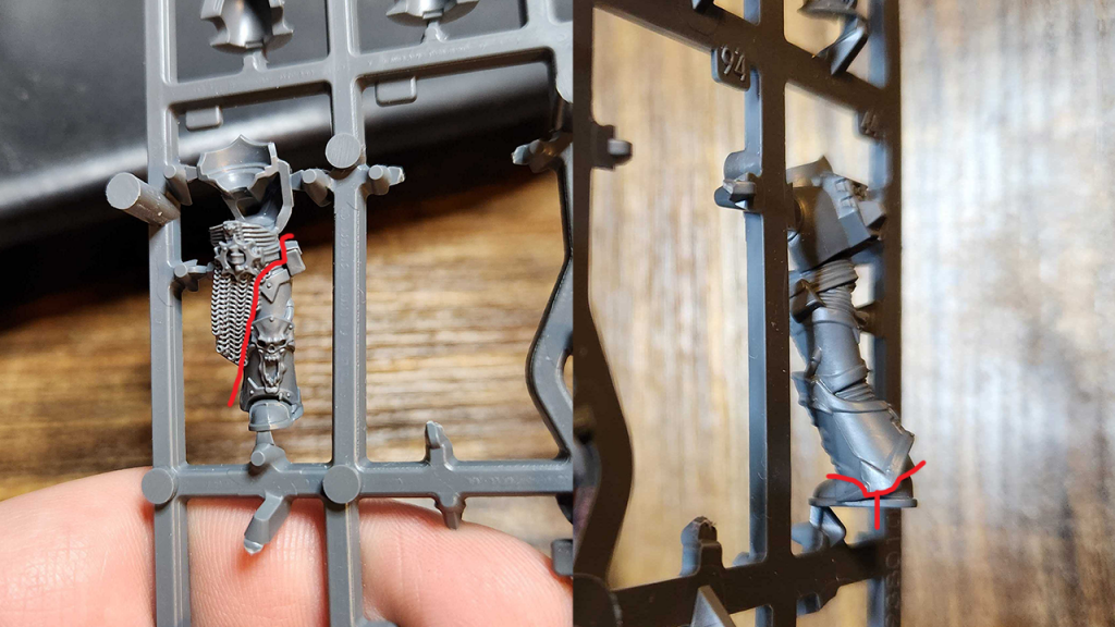 Once you've done that, there are three cuts you need to make on each leg. First, you need to cut the leg off the body. You want as clean a cut between the leg and crotch as you can get. In the photo above I've shown where I'd do that, but I'd use other legs before this one as you have some better options that have both more of a bent knee and also will take less detail off the leg. When you do this, the crotch of the model is going to end up mangled; do not worry about that - no one will ever see that bit.
