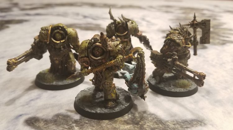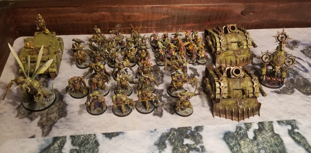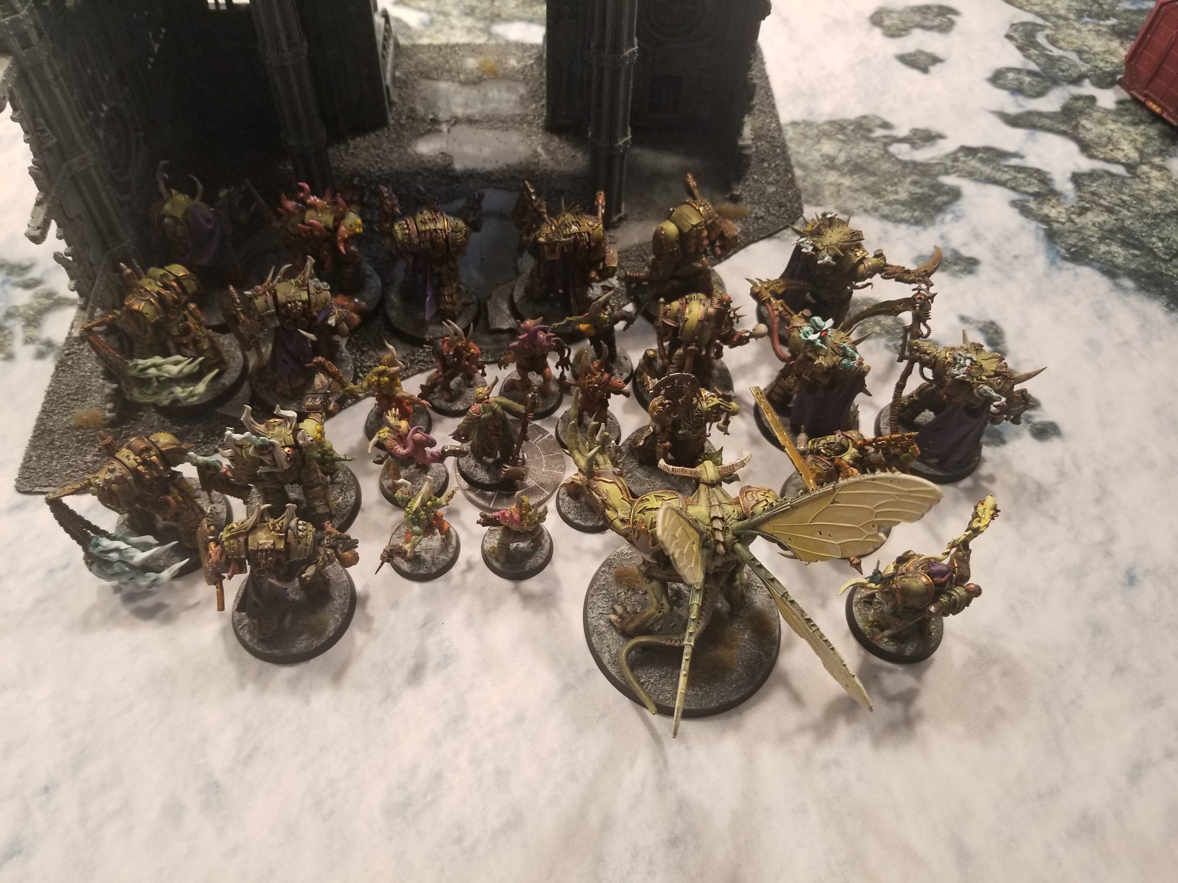 EL: Blightlord Terminators x10: 2x flail, 2x reaper autocannon + Combi-bolter, 4x axe + combi-bolter, 1x balesword + combi-bolter, Champion: Combi-bolter + Bubotic Axe, Plague Skull of Glothila (-1 CP) EL: Deathshroud Terminators x3: Champion w/chimes EL: Foul Blightspawn: Relic: Revolting stench-vats, Plaguechosen: arch-contaminator, viscous death EL: Biologus Putrifier EL: Tallyman