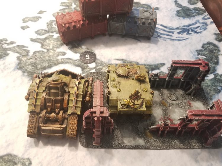 That Cronos is gonna be a problemOn his Turn 4 Swiftblade's major goal is to keep all three of his objectives and prevent me from scoring primary points. He doesn't really have a path to killing my characters at this point - I'm going to lock him out on Assassinate - but he can reliably score Engage for three quarters if he keeps his Cronos in play and potentially all four if he gets creative with his Raider. Instead, he plays it safe with the Raider and puts it on top of his building to try and snipe my PBC. It won't get there, but his Cronos moves up and charges into my Poxwalkers and PBC, and in doing so is able to contest my right side objective, putting me down on the count again for primary on my turn. Swiftblade played a great primary game all game, pulling out 10 each turn while keeping me on 5 a couple of turns and forcing me to make up the difference on secondary objectives.