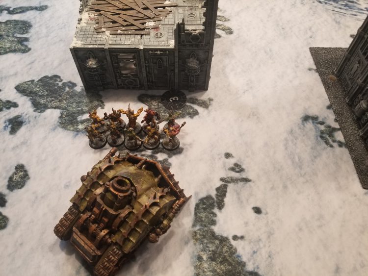 that mortar fires flaming balls of garbageThen on the left side I've got some poxwalkers to spread the sickness and potentially screen my other PBC. This PBC is a bit exposed so I'm not sure how well I'll be able to do that but this is the best I'm going to be able to do with this deployment and putting an attractive unit on that side of the table at least gives me a bit of a speed bump that I can respond to if Swiftblade drops something on my flank.