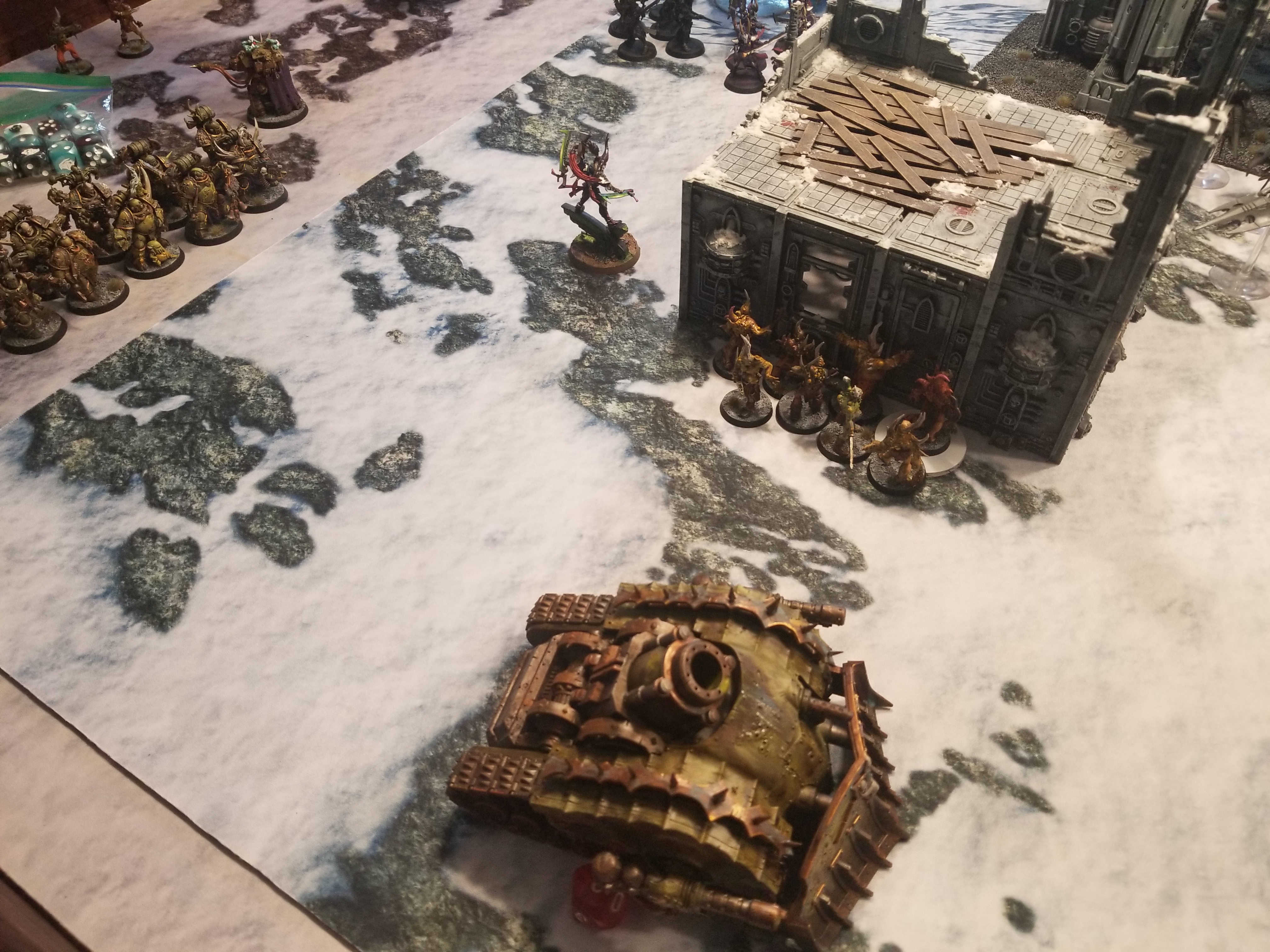 not a good signYep, I was right. Swiftblade opens Turn 2 by popping his Incubi and Drazhar out of their Raiders and using the Drukhari's Turn 2 Power from Pain to advance and charge them across the table and into my PBC and poxwalkers, and sends in his Reavers for extra measure. They dispatch both pretty easily, but get a great taste of The Bullshit when I spend 2 CP to force the PBC to explode. The explosion drops 2 damage on Drazhar, kills 3 Incubi in the squad fighting the PBC, takes out a Reaver, and kills another in the squad that fought the poxwalkers. Swiftblade has all four table quarters, so scores 3 for Engage on All Fronts and another 3 for having Banners raised, plus 10 for the primary objective. He's also fought me off my left objective, denying me 5 points for Hold 3 on primary in my turn.