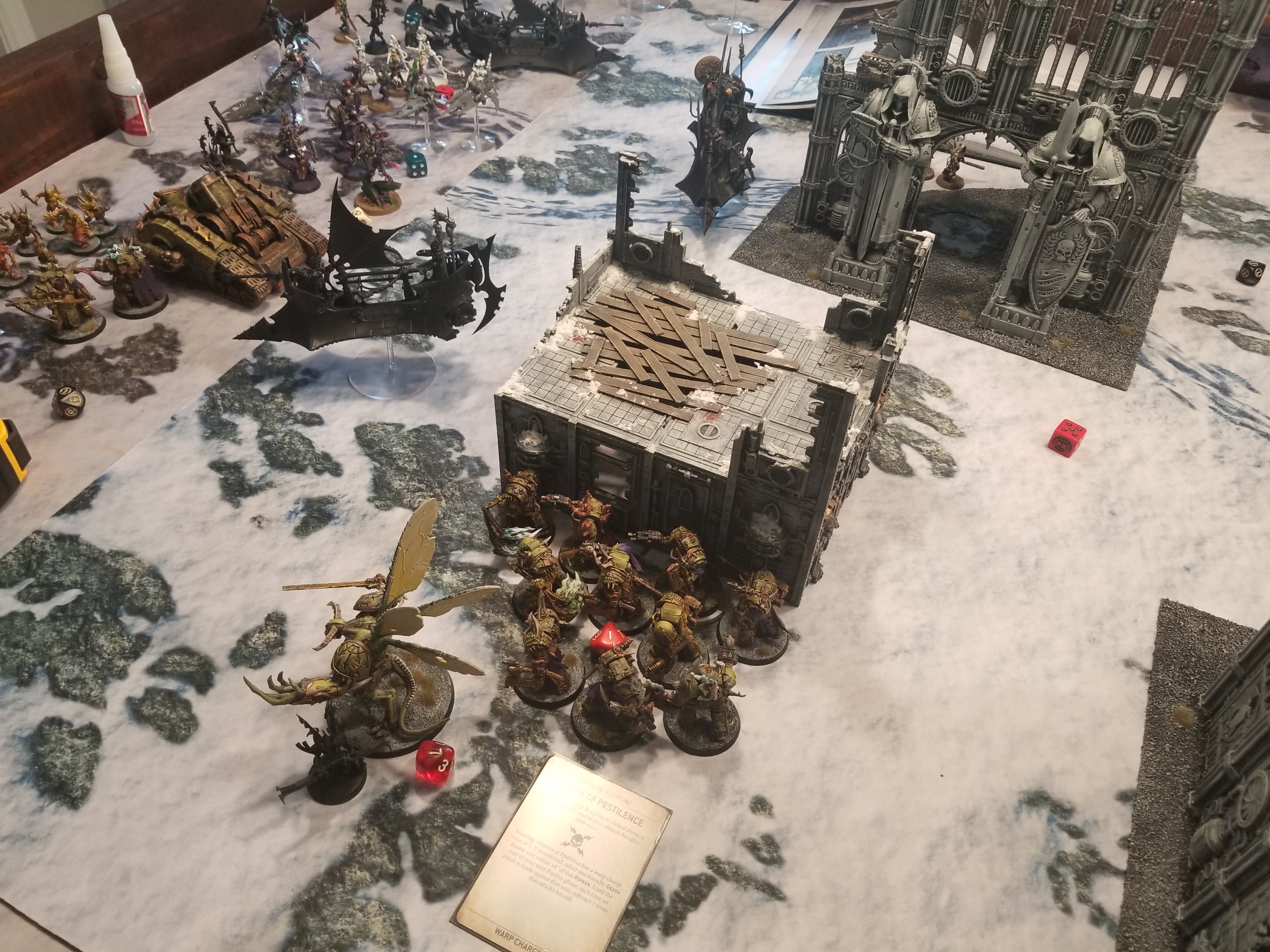 More chaos ensuesSwiftblade's Succubus unfortunately biffs both of her charges and is stuck watching as the battle unfolds on my left flank. Swiftblade smartly takes on the blightlords first, who lose 3 models to the Wyches' bullshit as Miasma of Pestilence puts in real work. I respond by using Counter-Attack on the 5 Plague Marines who survived the Cronos' shooting to fight the Wyches on my right flank. They do OK throwing out extra attacks with Trench Fighters but some good luck keeps the unit around with 1 model. That's not normally a huge issue but it hurts me for Grind Them Down and also the Cronos just tear through the Plague Marines who survived and brings 3 wyches back to life, though he'd later lose all three to morale and keep one model alive. The Blightlords completely shithouse the Wyches and the Daemon Prince kills the last Incubi but doesn't manage to dent the Raider, who's hanging out over here to give my units -2 Ld with Trophy racks. The Blightlords manage to pass their Morale test and on my turn I wipe out the Raider and the Succubus on my left flank while on my right flank the PBC kills the other Succubus with a Disgusting Force mortar and kills a Cronos with its Entropy Cannons while Mortal wounds from the Plaguecaster and a sewage hose shot from the Blightspawn kills another and does 2 damage to the third Cronos. That's enough to score me Grind Them Down again, plus I scored 10 on primary for Hold Two, and I've killed two more characters for another 6 points on Assassinate. That's a very respectable 19-point turn and now the score is 33-32 and I'm ahead by 1 but sitting on better (but dispersed) board position. My goal is to get back to scoring 10 per turn for primary and keeping ahead in kill tallies for the Grind Them Down point.
