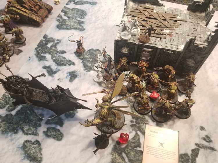 Swiftblade plays it pretty cool on his turn 1, opting to not just rush everything into my army - this is a bit of a first for him, and it's a smart move on his part. I've only got a little long-ranged shooting and it takes a bit of luck to destroy more than one raider. He pushes one of his Reaver units up to mid-table to get good shots on my PBC in dense terrain, then uses Fire and Fade to drop back with them out of range. Meanwhile he puts his raiders in position to set up some turn 2 Advance + Charge moves on my left flank, where the PBC and poxwalkers are unprotected. I manage to weather most of the storm, taking 6 damage on my PBC in the open from a dark lance, but the one in dense terrain dodges the heat lances. Swiftblade also raises banners on all three of his objectives, starting a string of 3-point turns that'll end up maxing out the objective.On my turn I have the tallyman bless the Blightlords and push them forward, just into range for the Reavers. The Plaguecaster drops Miasma of Pestilence on them and uses Curse of the Leper to score 4 mortal wounds on the Reavers before the Reaper Autocannons finish them off with 6 more damage. I don't even have to shoot the bolters. I have my PBCs throw shots at Raiders but end up whiffing on them completely and to add insult to injury Swiftblade uses Agents of Vect on Disgusting Force, something I'm using most turns of the game to get extra splash damage off the mortar. I also end up corrupting the left objective with my poxwalkers, and lose 3 in the process. The upside is that I killed a single unit of Reavers to Swiftblade's 0, scoring me 3 points for Grind Them Down. Also I didn't move my left flank PBC, something that could likely end up being a mistake.