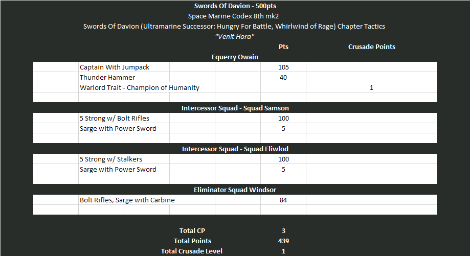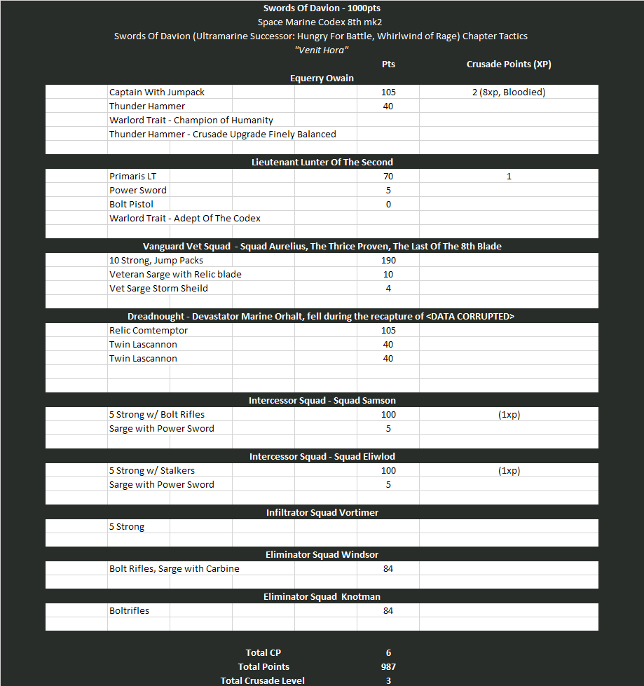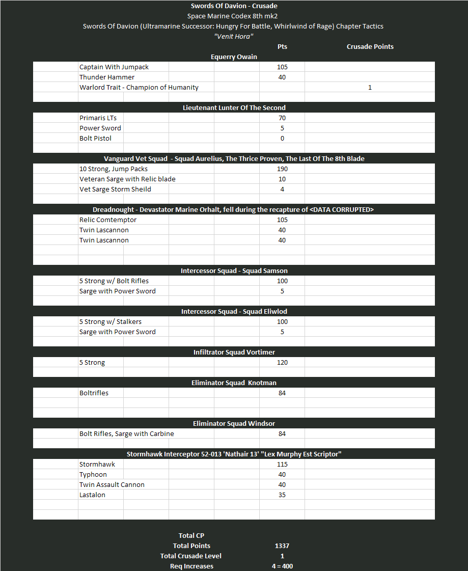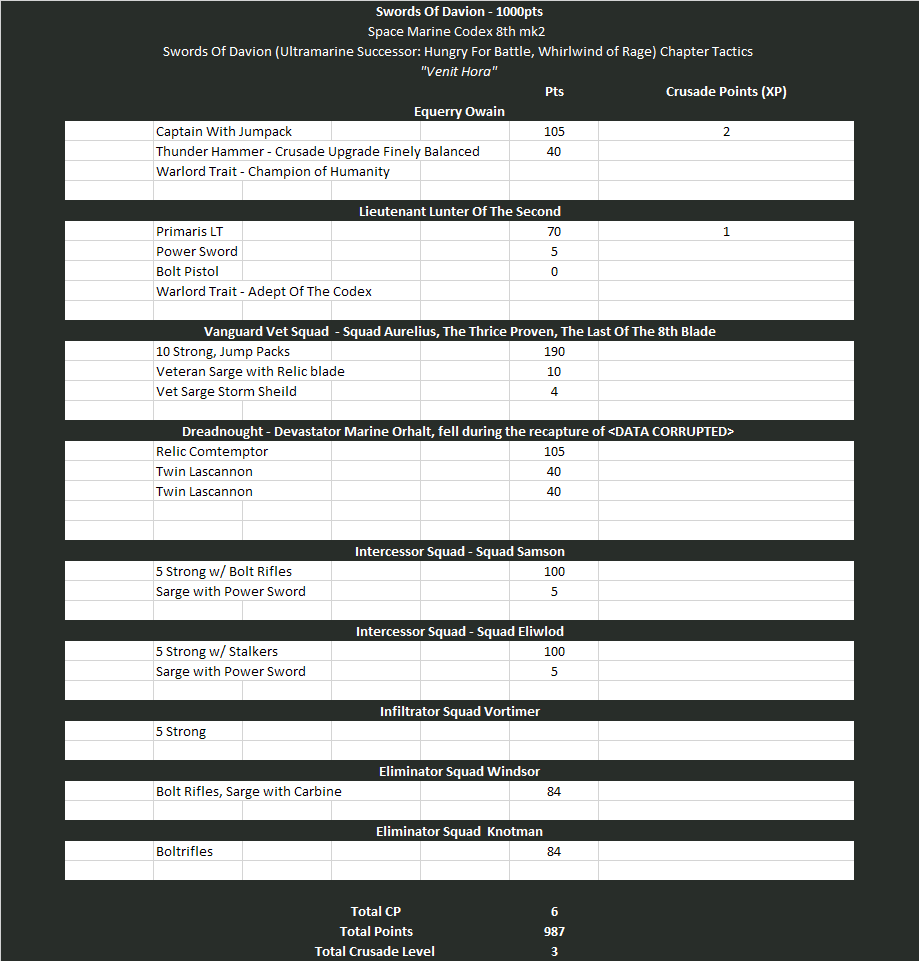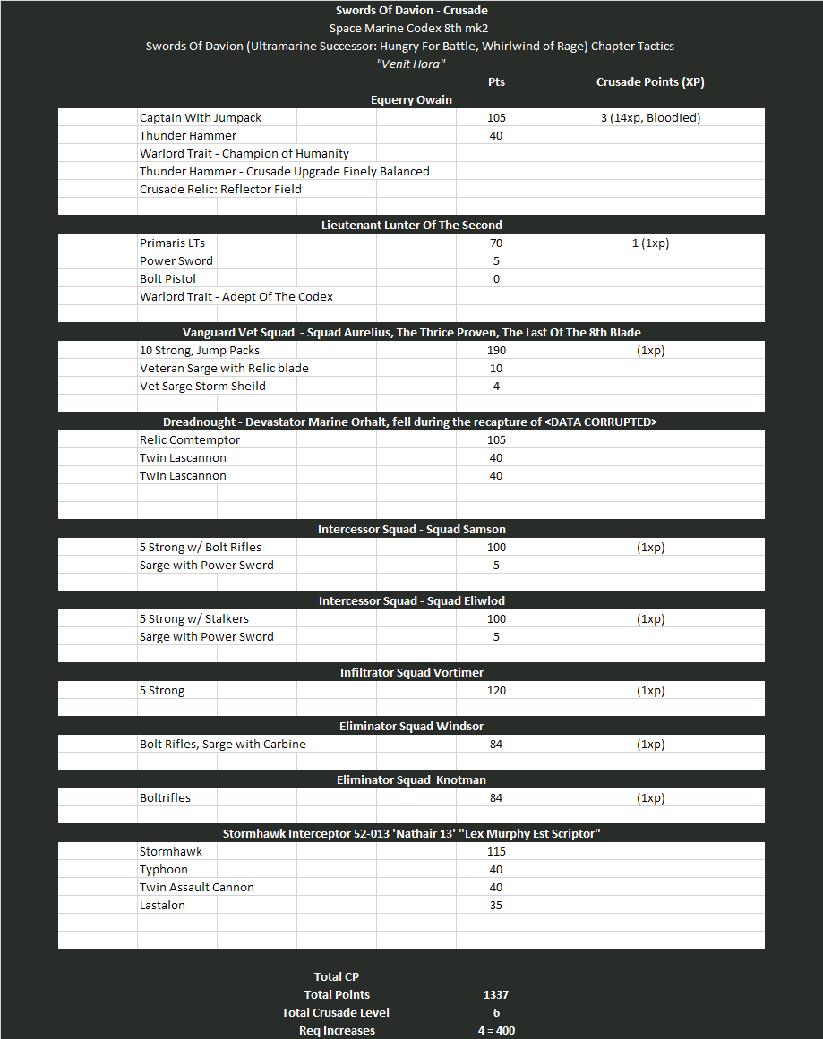 I too am a fan of the Roster system and the Crusade cards and I can not wait for someone to build something like Yaktribe to build me something pretty to keep track of everything. Until then I have a spreadsheet I cludged together and I can only hope GW’s Battle Forge will be the best thing since sliced bread.