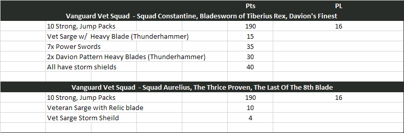 They also fall down in a heap when a unit has cheap options but also very expensive options. To use an example I'm familiar with, behold two squads of Vanguard Veterans: Both units have jump packs, however one is pretty much stock, the other fully tooled up with power weapons and storm shields galore.