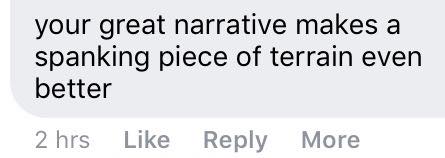 In particular, this taser-goading was prompted by a recent piece of terrain. As if to confirm that the universe did indeed agree with Rob and wanted a Narrative Forge article on the piece, someone commented this on social media: