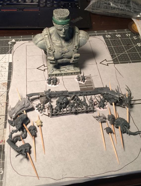 Pitiful skull count. Duke is dishonored, and this display brings shame to the regiment.You will no doubt have already read and savored the "creating and basing terrain" article, so I won't recap any of that here. Similarly, you should be very used to playing with your bits at this point and need no refresher. Needless to say, it was very helpful to have the necessary terrain materials and organized bits on hand when planning this project out. This made it easy to collect the bits I wanted to use, lay them out on the tile, and draw rough outlines in marker. Everything was spaced with gameplay in mind - the raised dais around Duke was drawn large enough to accommodate 40mm bases, while the central clearing can provide cover for a model as large as 100mm. You want to be sure to check this all before committing to a build, as there's nothing worse than realizing your lovingly-painted Warlord on a 40mm base can't pass through the hallway you just built!