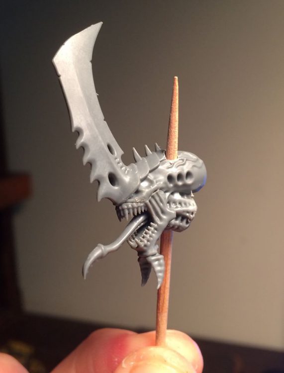 I'm only doing this because I love you. Would you rather be back in the bits bag, never to see the light of day?When hobbyists depict a character being run through by a weapon, they'll often cut the weapon and glue piece a on each end to give the illusion of impalement. While this can work, being even the slightest bit off makes the whole thing look wonky. And even if you do it perfectly, it's easy for things to snap off after gluing. Much better to do it right - in this case, power-drill a hole through each head and ram a cocktail stick through. What a rush! Almost like dispatching heretics yourself.