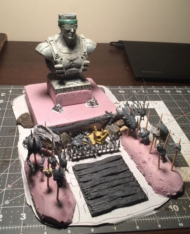 Starting to come together. 10/10 do want to be buried here, after there are more skulls.Once the skull mounds were complete, I cut out hunks of pink insulation foam and began roughly arranging all the components. Remember all the talk about repurposed toys in the "playing with your bits" article? My box turned up the wooden slats from an old mummy playset, which fit perfectly in the central area. This also implies that the area is frequently visited, so the soft earthen ground needs reinforcement to avoid being churned into mud. As a focal point to the piece, you can see where a soldier might kneel under the Duke's mighty gaze.