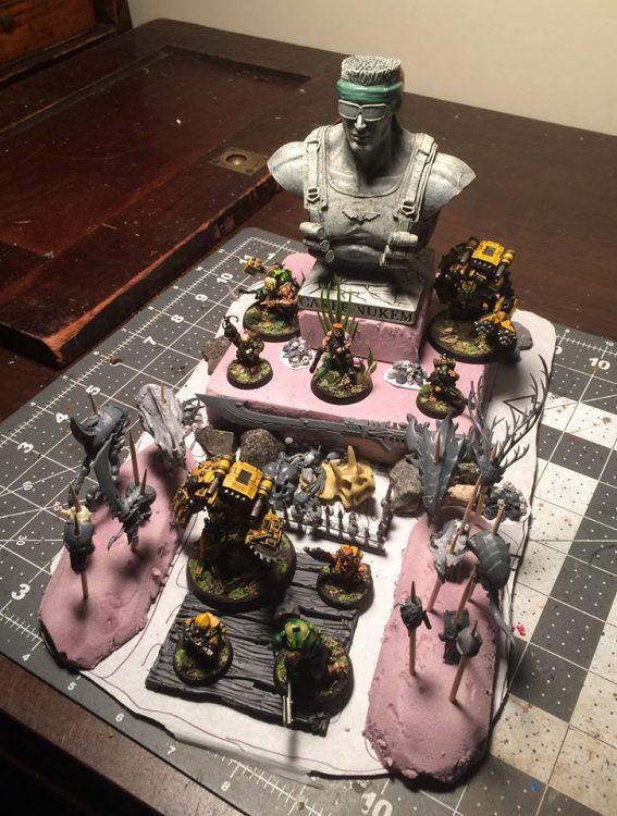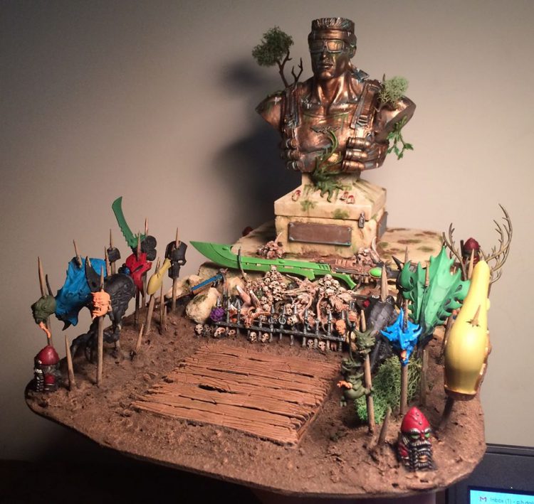 "I came here to be tossed in the trash and be loved by Brother SRM... and I'm all out of being loved by Brother SRM."The Catachan are always portrayed as ferociously loyal Imperial warriors, but not particularly pious. For years I had the idea of a Catachan shrine to the Emperor which, instead of stained glass and candles, would have trophies from slain enemies of mankind laid as tribute. What greater worship of the Emperor is there than killing in his name? The only problem was that I could never find a cheap Emperor miniature. With the Duke in hand, I decided to take the same idea but put a Catachan "tomb of the unknown soldier" twist on it instead.