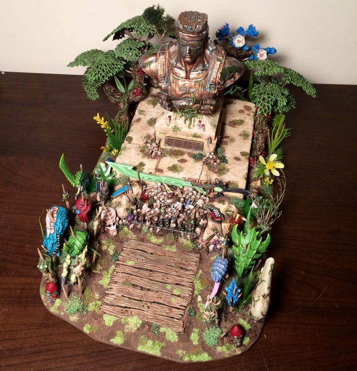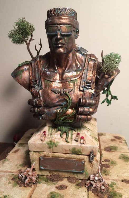 As a reward for your persistence and good behavior, here is a picture with paint.Clearly, in this terrain piece, the statue is the focal point. With the new greenstuffed bandana and Imperial Aquila, we can no longer call him Duke in good faith. I have rolled on the Kill Team Catachan Naming Table and it turns out that this was a fellow named Grytt (13 on a D66). His demeanor was Gung-Ho (10 on a D10), which is highly appropriate. Rest in Peace, Grytt.