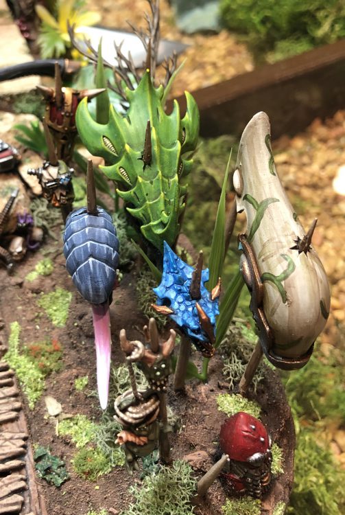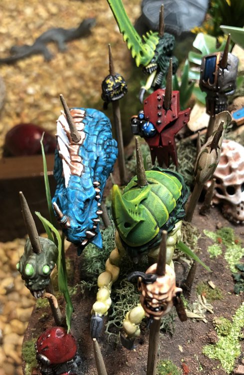 Grytt and the gang.With Grytt's colors in place, as well as the stasis generators painted to match my Squat army, I began selecting colors for the impaled heads. Blues, greens, tans and reds were all safe colors that were already established in the model, so I went with them to avoid the model looking too chaotic and "noisy." Those broad selections also gave me enough latitude to accomplish another goal of the terrain... paint up as many of the heads as possible to resemble my common gaming opponent's armies. Raise your hand if you saw that coming a mile away.