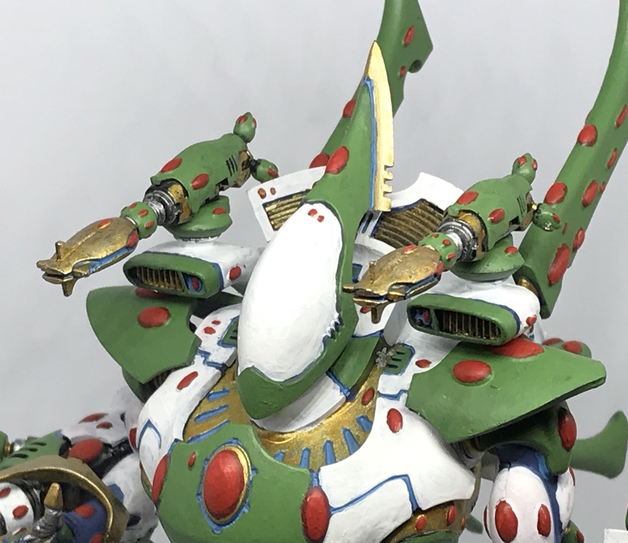 Lets start off with the key thing - the Expert Crafters/Masters of Concealment combo is a really, really good Craftworld trait. Plenty of Marine lists have seen success with their equivalent, and lots of things in the Aeldari range are pretty good with it. The most obvious standouts are Vibro Cannons, but I don't have those painted so we're going to have to make do with my large, ridiculous robot son instead. A Wraithknight with the guns wants everything that this combo brings to the table. Masters of Concealment forces enemies to close to well within his threat range if they want to bypass his cover, and gives him a hefty save if they don't. Meanwhile, with four "big" shots its in the sweet spot for benefiting from the offensive re-rolls of Expert Crafters as well, often letting it get all four of the shots through against a conventional vehicle and threatening to blow them to bits, especially if you have an Autarch or a Fateful Divergence caster around as well.