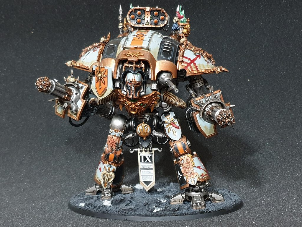 Photo & Model: WhiteOutMouseWhat that stuff doesn't really bring to the table is shooting threat, but "luckily" a dual avenger gatling cannon Knight is here to graciously play that role. Much like the Krastsader, this can be customised for a few different matchups via relics and traits, and this player has come to the same conclusion we did in our review, which is that you may as well be a Dreadblade for access to additional choices. The only thing that initially caught my eye is the choice to make it Infernal rather than Iconoclast. The latter gets more customisation choices via Vows, but having mulled it over I think I understand the Infernal choice here and agree with it. Because all the threats in this army are rock hard, there's a good argument that plenty of forces should go after the Knight first to try and put it down - especially mobile ones like might that might be able to mount a successful fighting retreat against the melee threat. The "Pact with the Dark Gods" stratagem (i.e. "Stand back up on a 4+") makes that option look extremely sketchy in ITC unless you've got an easy way to rack up another kill turn 1, and this army doesn't expose many easy targets.