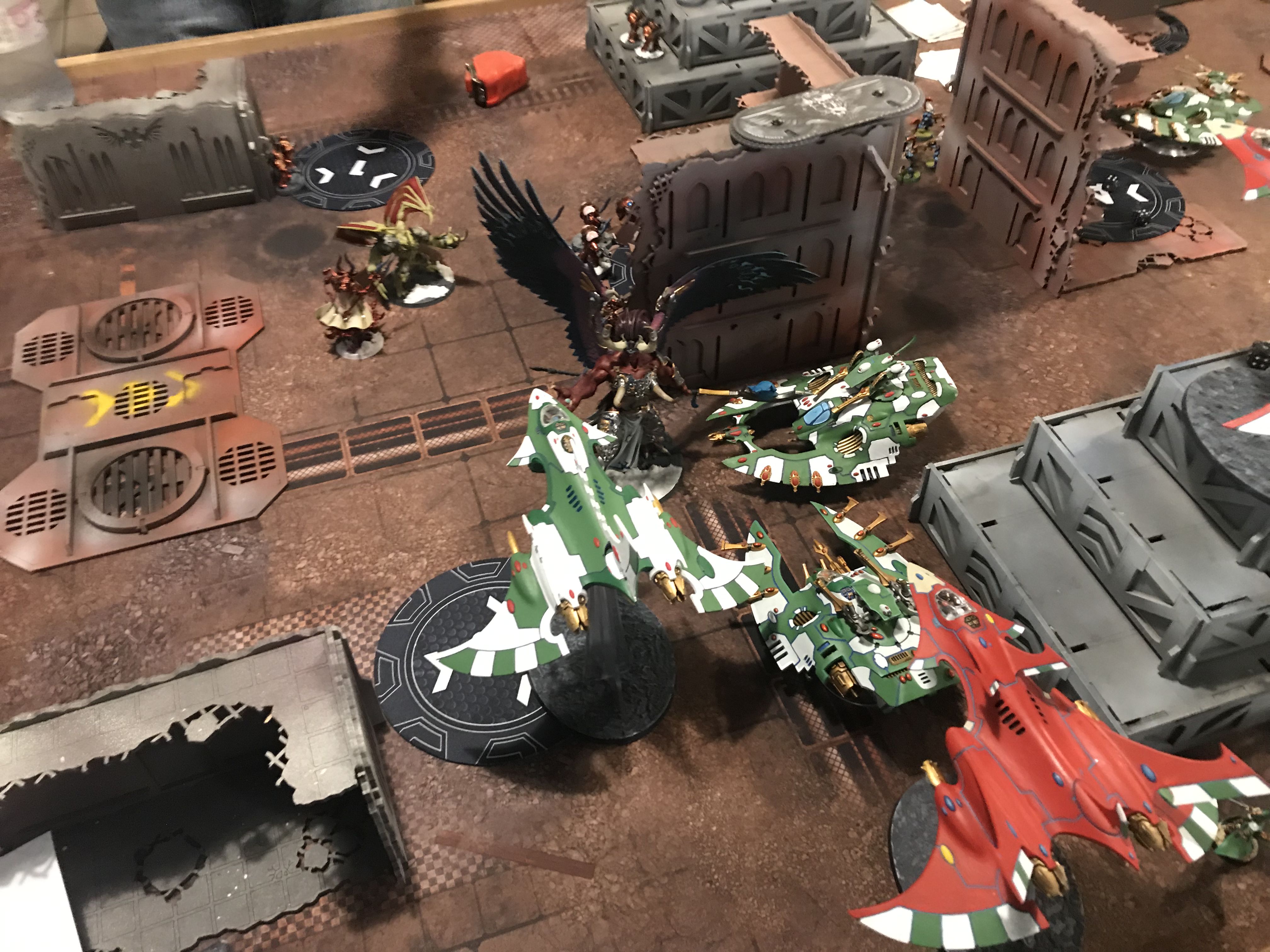 That put the game firmly into my court, as a psychic barrage and Serpent shields took out the Lord of Change sharpish, while some planes also popped a Rhino. My opponent went for a big swing turn 2, attempting to take down a bunch of planes with deep strikers, Daemon Prince charges and psychic, but it was a gamble and it didn't pay off, with none of the planes dying and leaving me with overwhelming superiority on the board. On my turn 2 I did easily enough damage to ensure that he was never getting back in the game, and that the big Rubric squad would get bully charged every turn and never shoot again, and things were basically over.