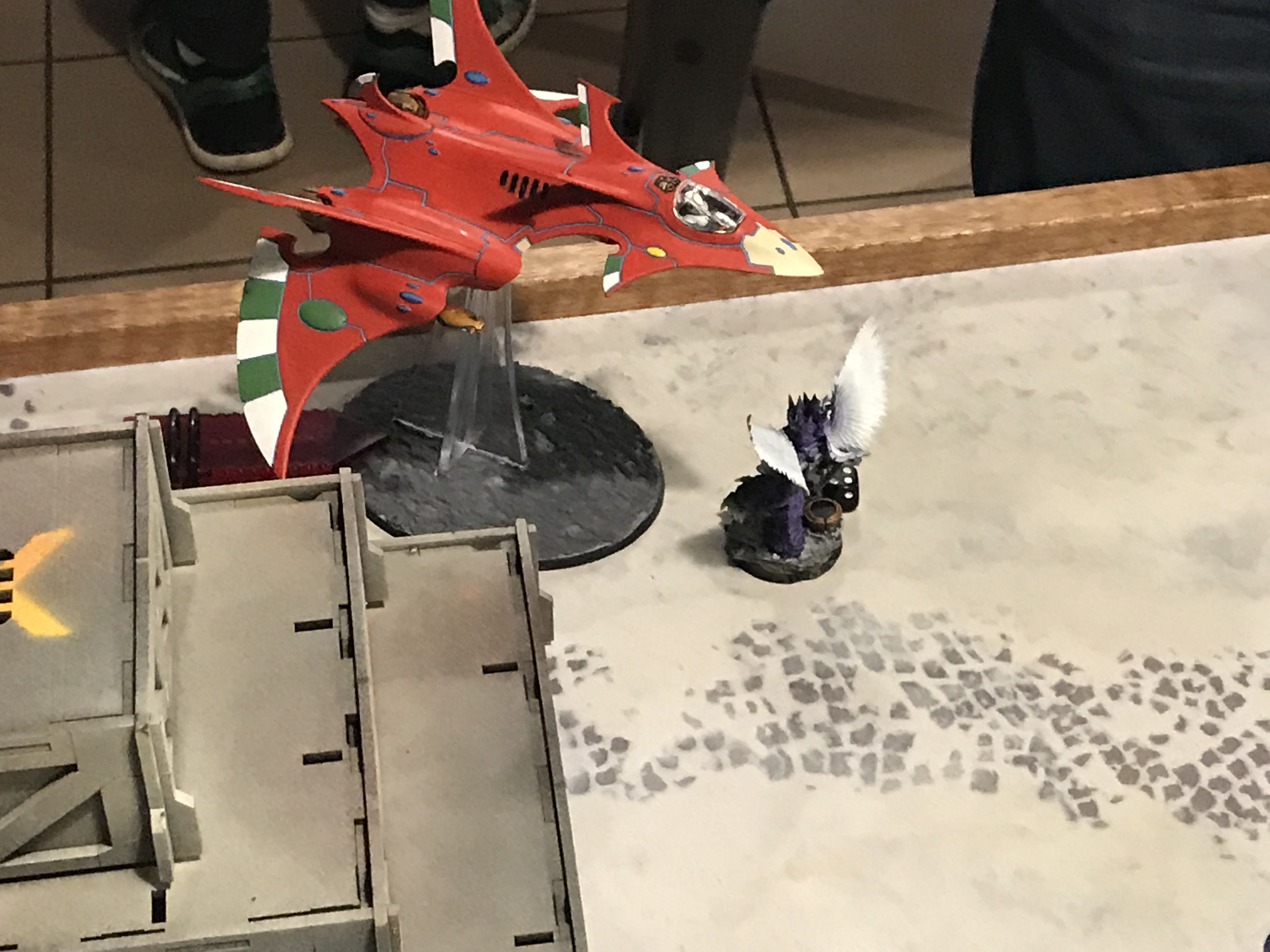 My Hemlock continues its run of being bullied by bigger, meaner planes.With that, it was game over - I picked up all his ground forces that were up in my business with Shurikens and psychic, took one Fire Raptor out of the sky with my Autarch and a Crimson, murdered his Chaos Lord with another Crimson and had the Night Spinners left to shoot out enough of his last cultist squad behind a ruin to boots him, as the second Raptor was his only remaining model.