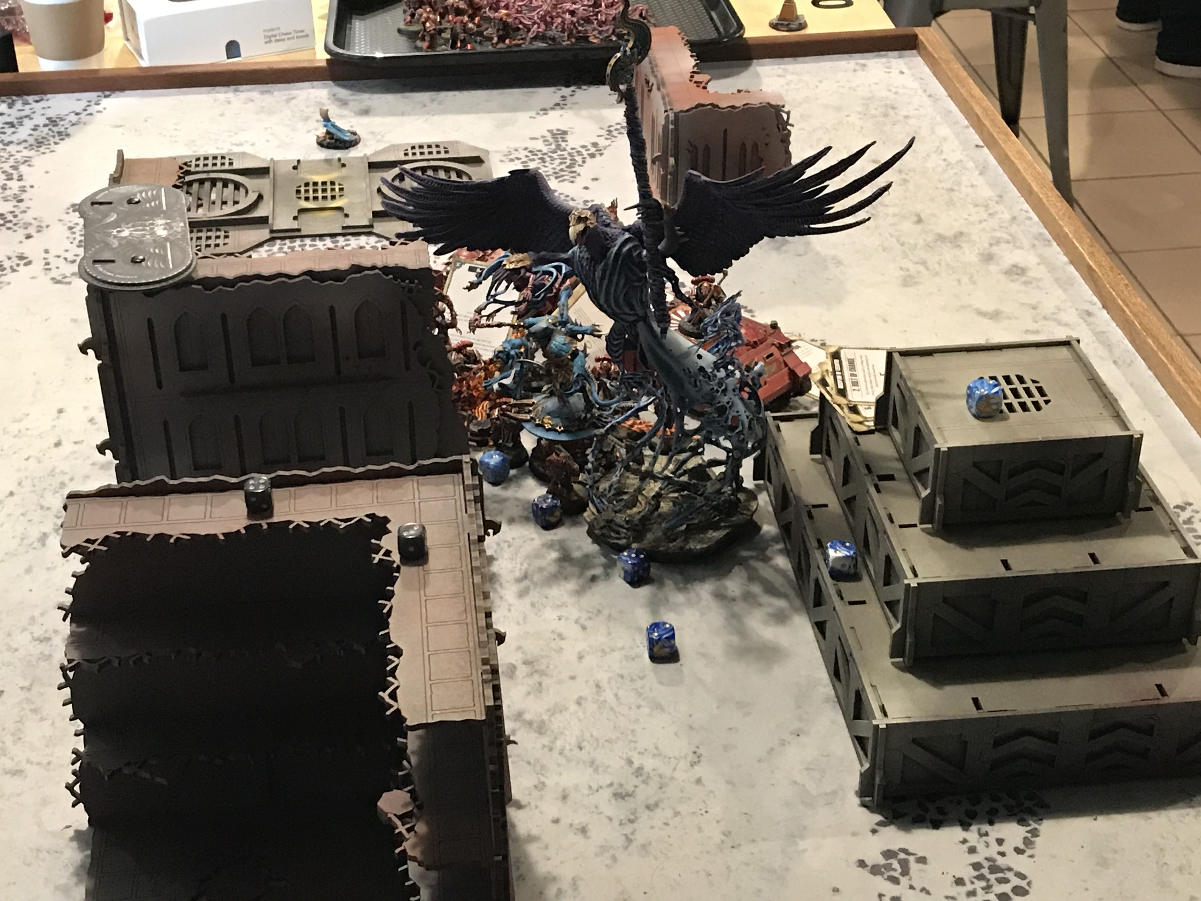 A lot of his damage is tied up in the psychic of his Warlord and various other units, but by backlining heavily I can force them to either come to me or skip out on doing stuff turn one (which I put him on). The biggest threat at that point is him landing a super Infernal Gateway on my castled up forces. With that in mind, I put a brave and heroic Wraithlord out way in front of my army to take the hit, and planned to either out attrition and out board-control him if he chose not to go for me early, or to kill his warlord and follow through hard if he did.