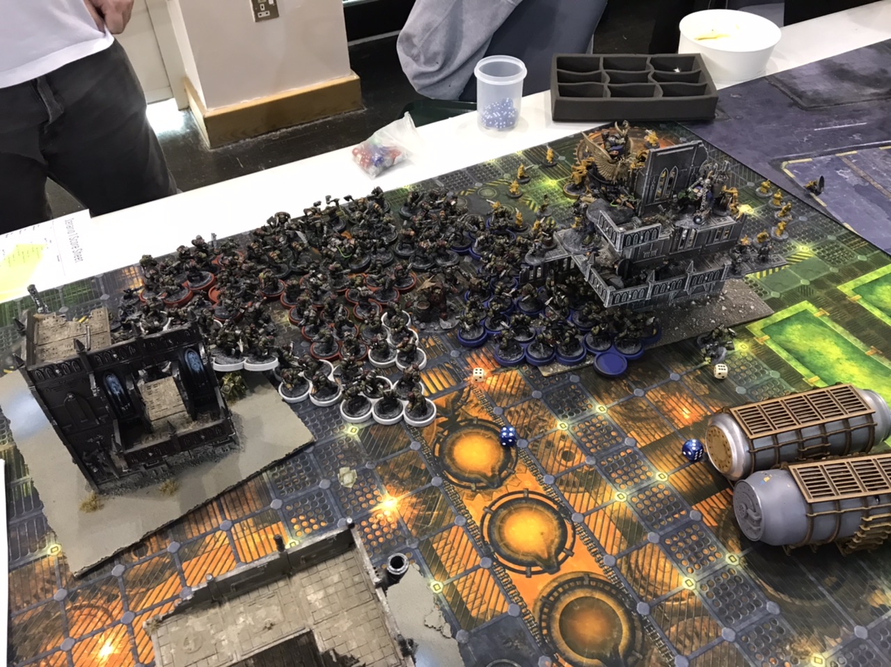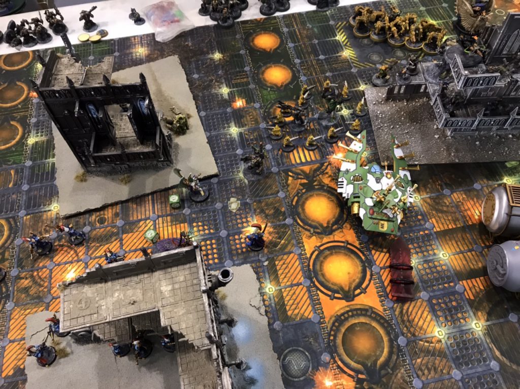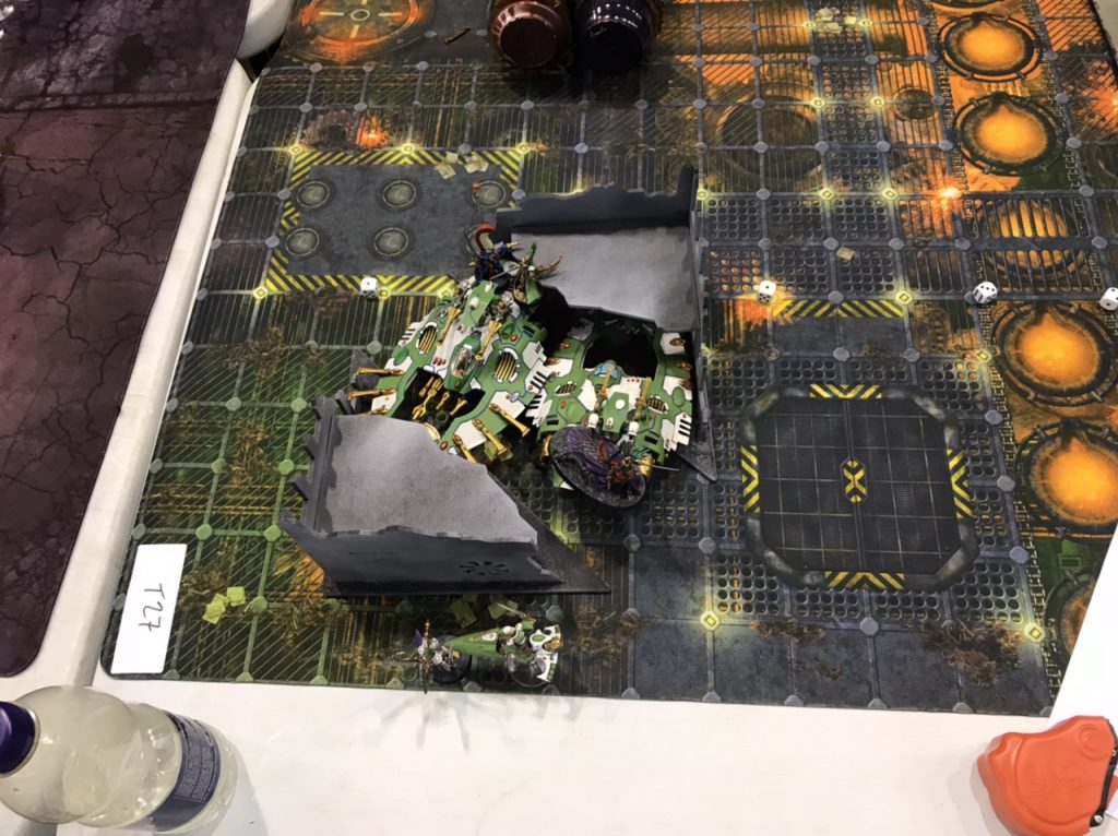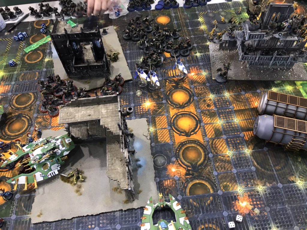 This is a pretty horrendous matchup once you factor in the mission (Cut to the Heart) and deployment we rolled (Vanguard Strike). While I do have the shurikens to carve through 120 Boyz, and the emergency stop button of Vect for Green Tide if I mess up, the maths is badly against me here because his shooting is so good. We were on a board which wasn't a standard L-block setup, and the more interesting ruins on it gave his SAG Big Meks tall things to stand on, making it near impossible to hide from them.