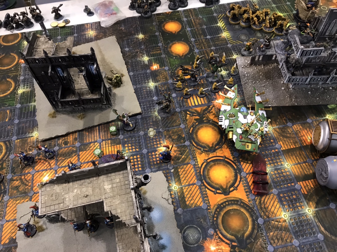 Pictured - me forgetting Iron Warriors ignore coverThis went more or less exactly to plan. He deployed his Nurglings as Engineers on one objective and castled up on the other, so I set up a single serpent to drop off enough Dire Avengers to deal with the Nurglines then come back in, while putting the rest of my forces straight opposite his.