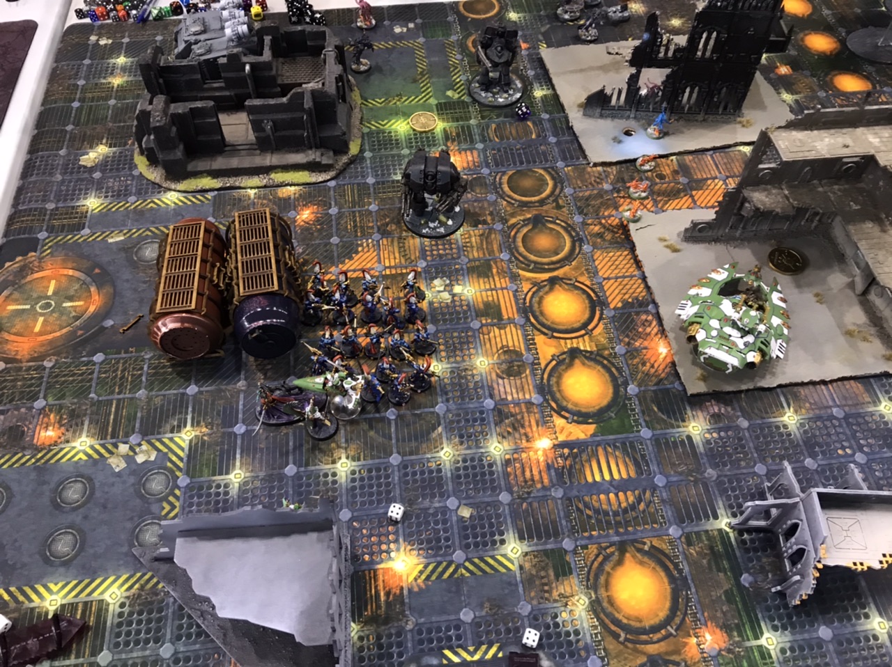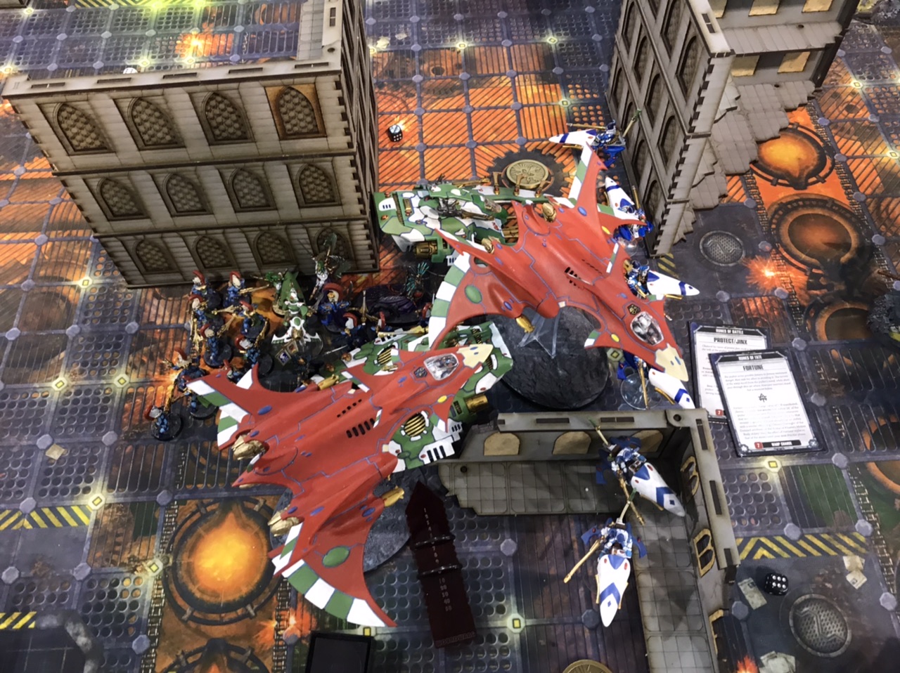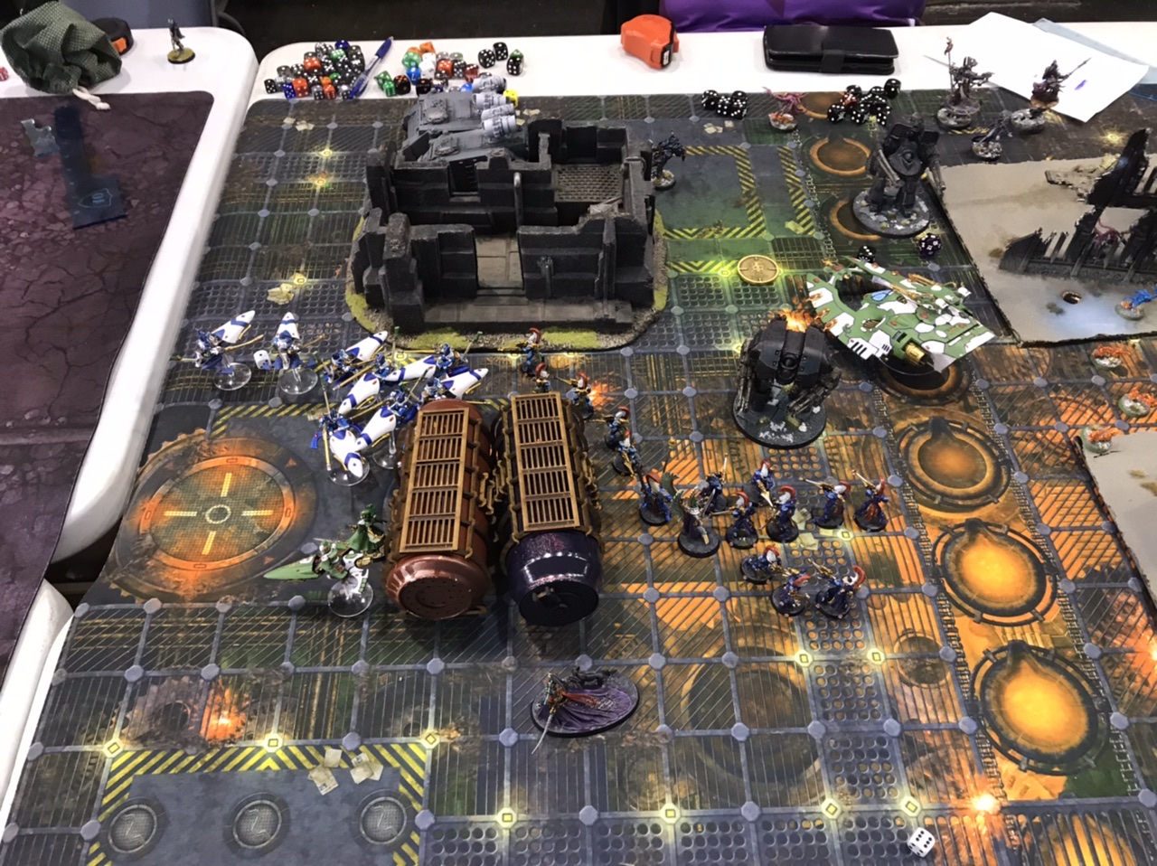 At least we deployed cautiously because...My opponent seized on me, which initially felt like a classic way to end an accursed weekend, but actually quite quickly turned out to help. My planes were out of range and I'd hidden my spears well enough that once I lightning fasted them he switched targets, but once again ran into my resilience to D2 firepower (and, admittedly, his chronic inability to roll higher than a 2 on his d6 damage shots that did go through). He killed nothing turn one and I smashed back to kill some vibro cannons and pick up a Wraithlord with Doom/Shurikens. I moved the Spears out front and Fire and Faded them to screen the rest of my army - they'd lost a few turn one, and I felt selling themselves dearly was probably their best use. This also helped because he'd used hero's path to sneak on to a second objective, and with careful positioning their Fire and Fade got me onto three.