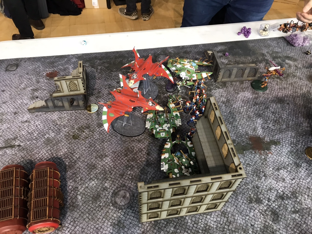 Potentially a tough game here, but some elements of his list should help me compared to other versions of this. He's a bit lower on firepower, and if I can line up a good turn of Doom shooting against the Wraithblades I can make a big hole in them, maxing Gangbusters on the way. The Crimson Hunters also immediately look pretty good - being able to go to -3 to hit actually matters a lot against this list even with all the re-rolls it has, and also makes a plane completely unhittable by a moving Wraithlord that's out of range.