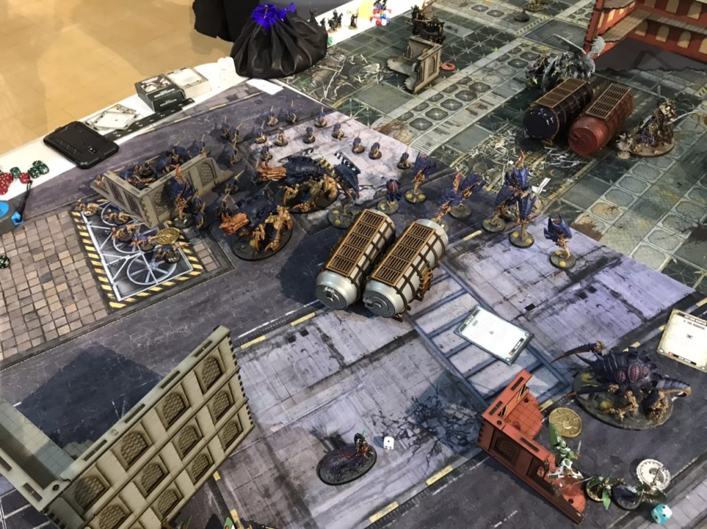 I lost both planes to various murderous firepower (I could probably have got away with committing just one, I'd overestimated the toughness of a Biovore), and on turn 2 didn't do as much - I missed Doom on the Gaunts I was trying to smash hardest, and thus while my Spears were able to drop in between L-blocks (and out of sight of his stuff) I didn't get a kill, leaving two Hormagaunts alive. Bizarrely that might have worked in my favour, as on turn three he brought his rippers in and after he did some decent damage to my army, I was able to pick all of those up, and bring all my firepower to bear on taking out his termagaunts on the bonus objective with my spears, allowing me to match him for kills for the turn and take hold more and the bonus.