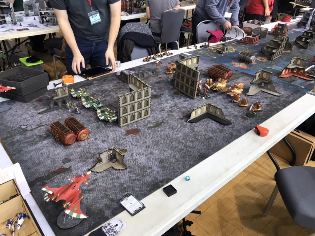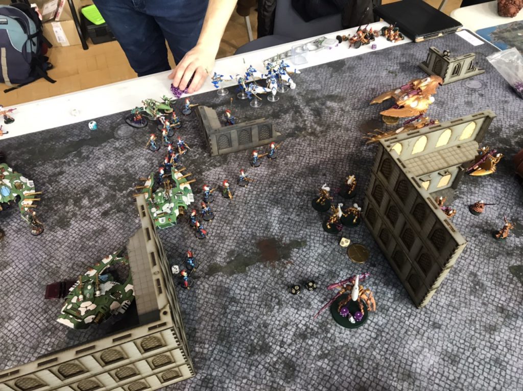 A brawl erupts around the centre and bottom objectivesWhile this game felt relatively back and forth on the table, going first and picking up early dominance of the board let me pick up a massive lead, and he was very unlucky with a few things (notably losing a key objective holding Death Jester to a combination of my randomly yeeting a few shurikens at him one turn because I could see the tip of his gun, and then a plane blowing up on him the next turn). I was able to neutralise all of his push elements and take out all my pick targets, and while both armies looked extremely beaten up by the time the game was over, I had complete control of the board and still had a plane up, picking up a big win.