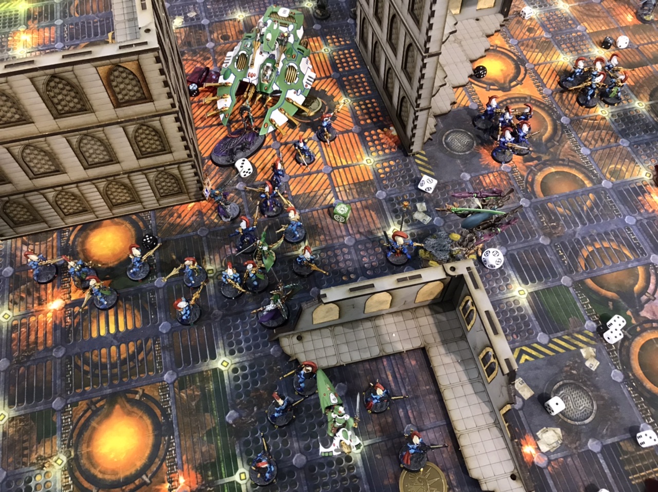 From here, though my army was gradually ripped to pieces I was able to take a full five point turn on four (I'd left single stragglind models from multiple squads and he only killed one thing). That was the last thing I killed all game, but I'd removed all his troops from the relevant flank, and thanks to bringing some Dire Avengers zooming up from the back in my remaining Serpent I was able to cycle stuff onto the bonus objective for the rest of the game, locking in a low-scoring win.