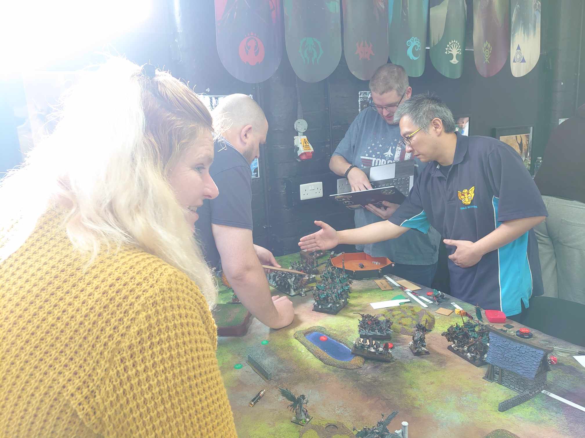 Our lovely and helpful judges crowd the table like circling sharks. Credit: Stephanie BeeThe eventual resolution is that Alistair can do it, and I wish him luck. He goes for it, and… double 1. OOF. That’s huge, and Alistair knows it - accepting his defeat is likely inevitable now, and being a very good sport about it all. The overall play wasn’t bad on the numbers - with average damage and getting the right Overrun, it works out at about 57%ish - but was risky enough that I don’t feel too awful. Plus, y’know, Magnilde’s still alive. Truly, that model is like a vortex of improbability when I play her, it’s amazing.