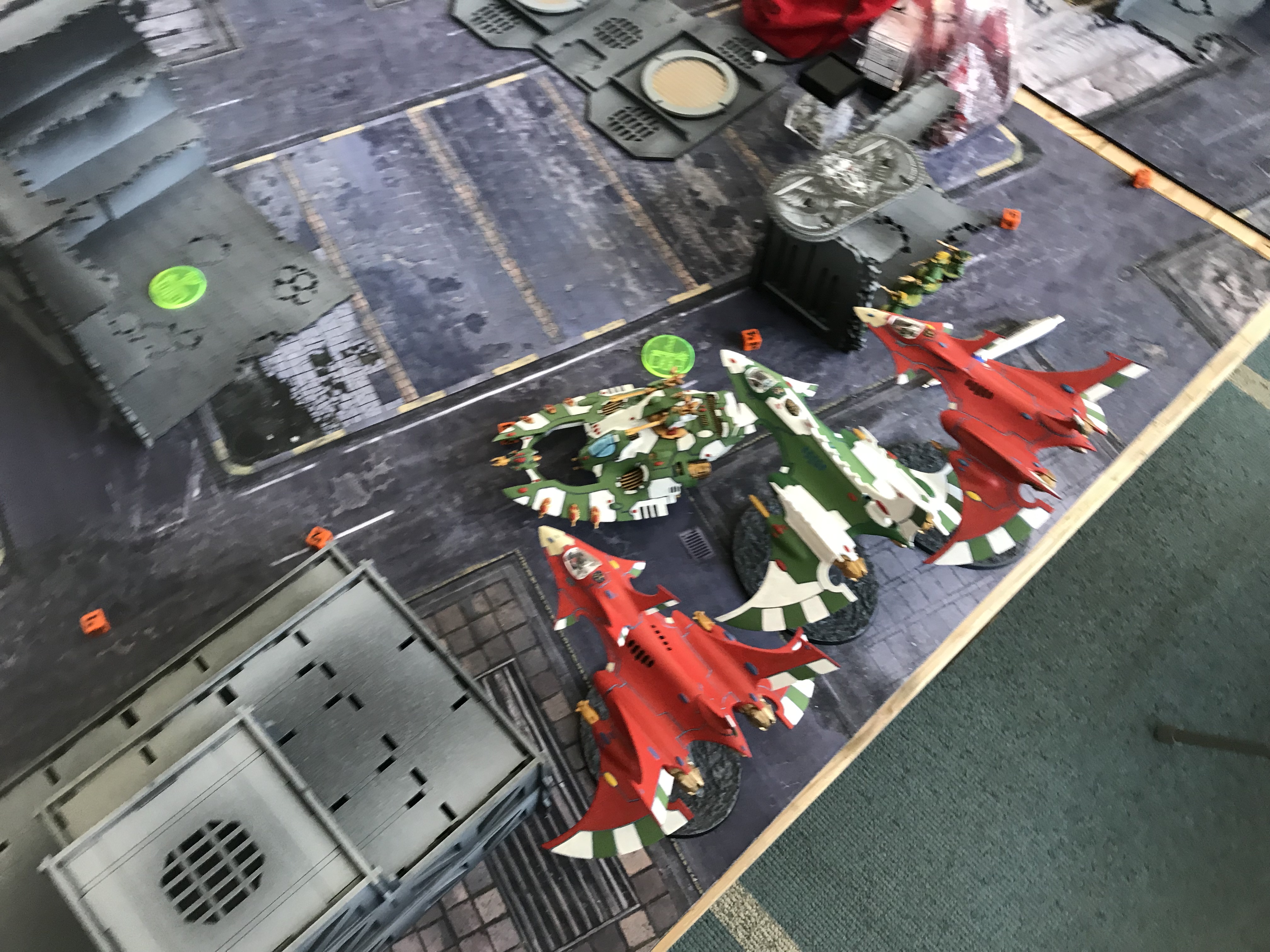 - Not setting up to block Mind Control. Once I'd decided to grab the middle objective on that first turn (absolutely the right play, as securing early hold more is huge here), what I should have done is set up the Dire Avengers in a perfect crescent the shape of a plane's base, and then flown it up to be directly in contact with them. That pulls double duty of stopping Mind Control and making the unit un-wrappable, as once the plane moves out there'll be a huge space to retreat into. The Mind Control thing is well known and I should have got it right, the basing thing is a neat trick for when you want to hold an objective but don't want to risk a wrap which I'm going to bank and remember.