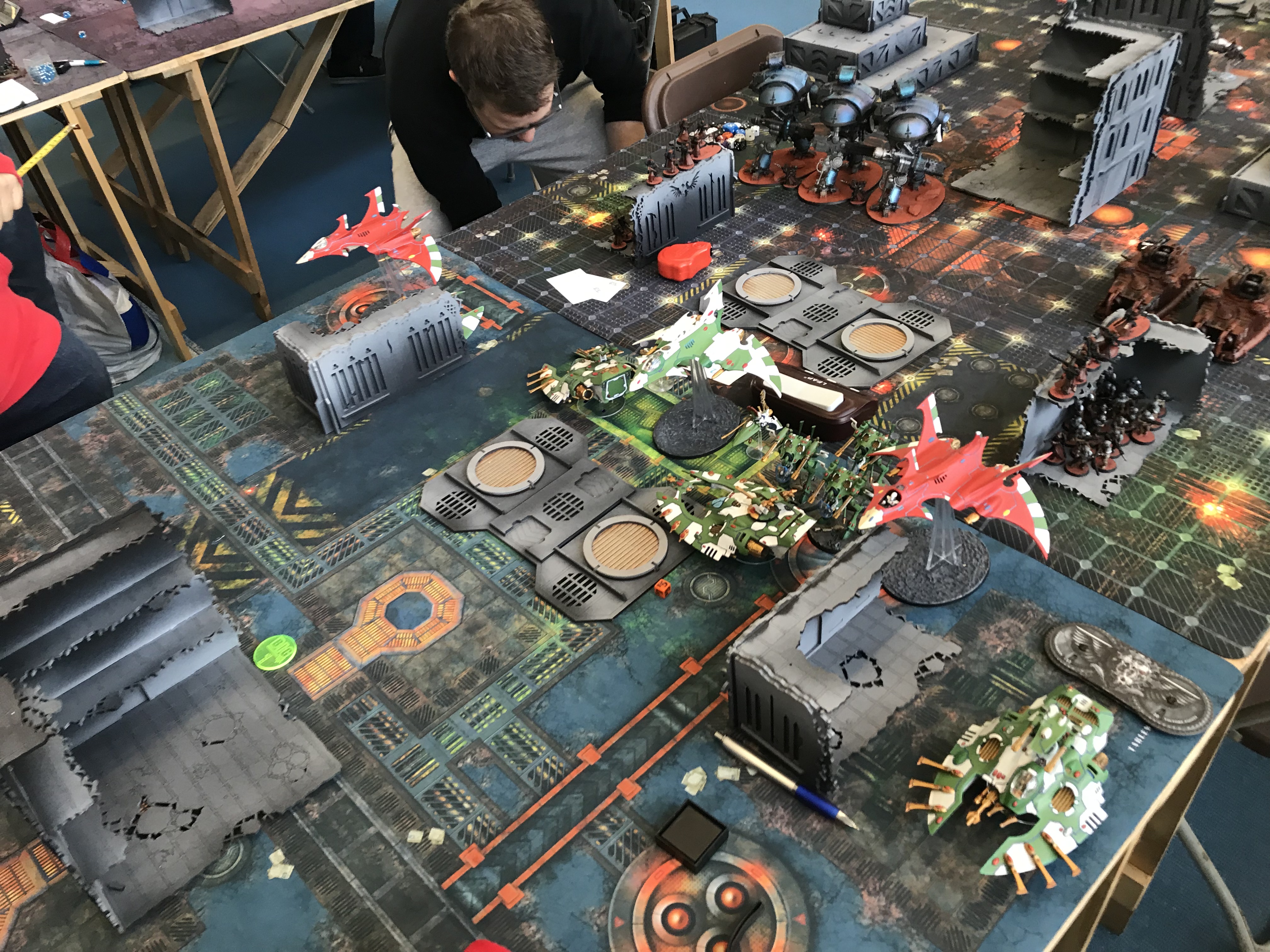 Deploying defensively was correct, but on my first turn, rather than flying the planes down the board and offloading some infantry to help make sure the Invictors died, I should have just crossed over the planes on my back-line and used them to land the Invictor kills, while pushing a Serpent and my Autarch towards the flank where his main force wasn't (out of sight from them). That would have kept the planes out of the Leviathan kill zone for his turn 2, and meant he got no benefit from the Leviathan or the smashcap turn 2. It would also have left me with my infantry ready to pop out of their tanks for a concentrated volley into his infantry on my turn 2, while sending the Autarch into the Leviathan at that point. That guarantees me up for a third turn of plane shooting, at which point his army should look seriously degraded, especially as my infantry will have mown down an Doomed intercessor squad or two. At that point, i can probably mop up what he's got left sufficiently to claim Ground Control without too much trouble, dice be damned.