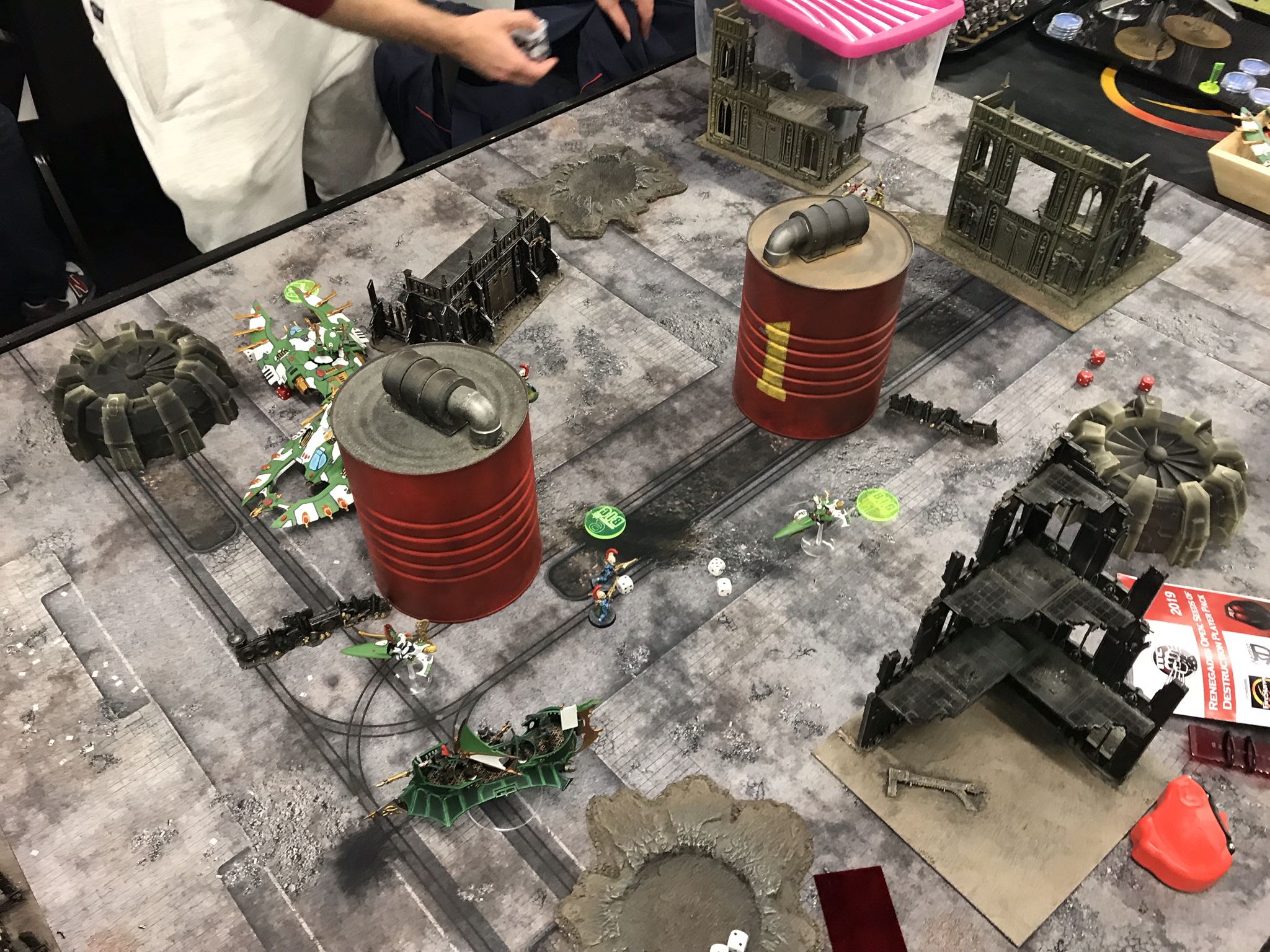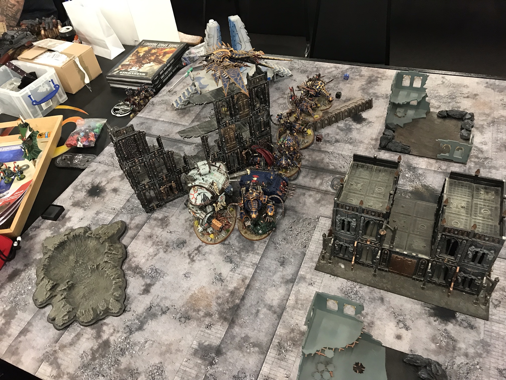 Battle in full flow. Photo: WingsWith that, I was able to close the noose entirely, killing off the second knight on my turn 3 while tagging the Deredeo and Las Contemptor in melee, while seizing a tonne of objectives. That left him with almost no offensive presence, so while it took me a few turns to pick everything up (and he took kill more on turn 4 after his Warpsmith managed to waste my Archon), the game was over and I maxed out points on 5 and 6 as I finished off his stuff.