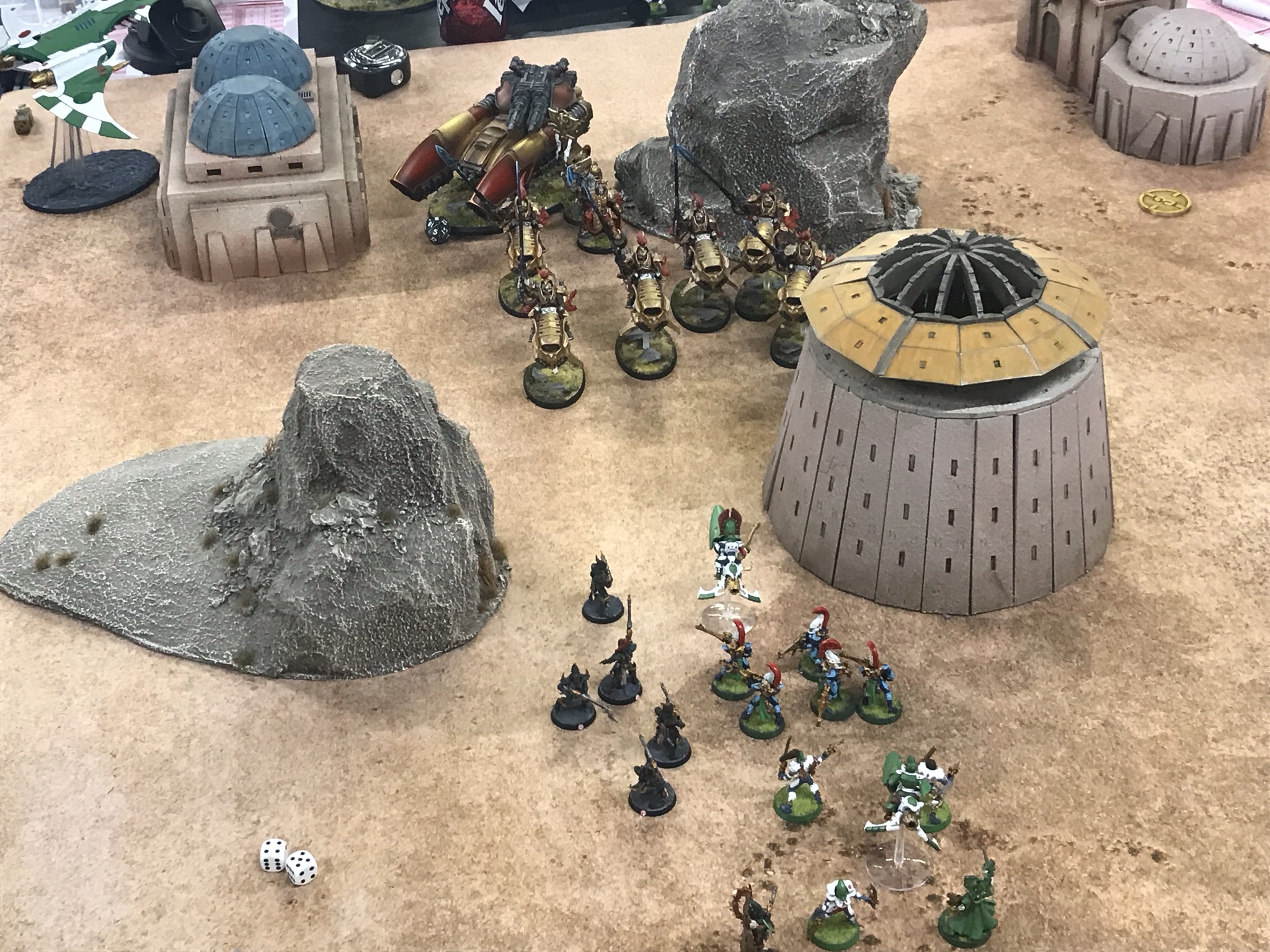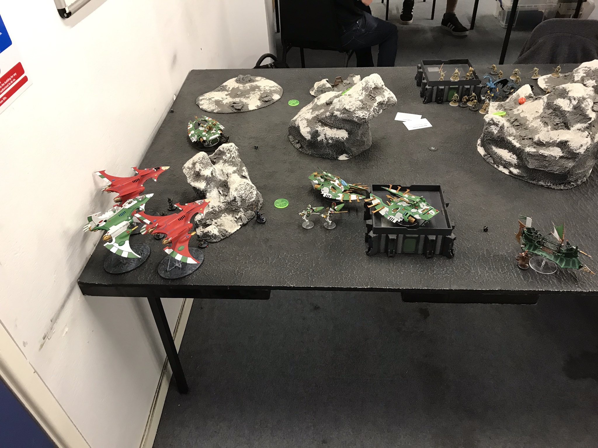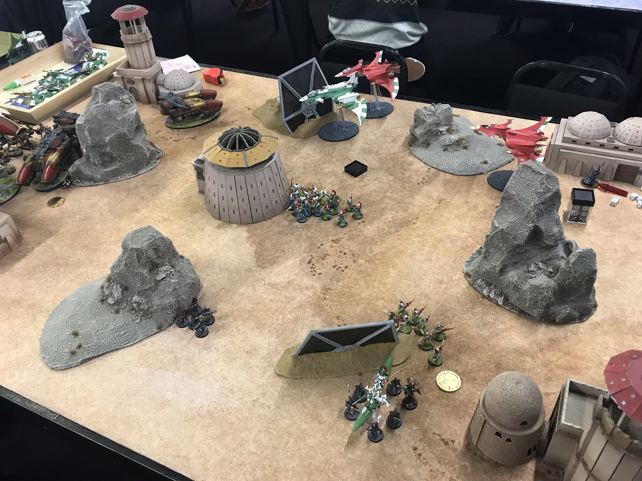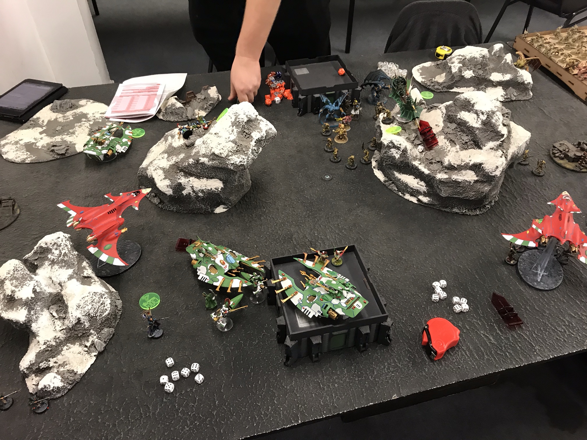 The hammer falls. Photo: WingsIt was OK - I low rolled a bit, but he'd moved a Caladius out of the banner bubble to take an objective, and the planes managed to take this one out, while the Reapers finished off their earlier target. I also moved all my exposed infantry as far out of LOS as I could However, he then proceeded to low roll in what turned out to be a terminal fashion on turn 3 - one Caladius completely missed my planes, while the Orion was baited to move up to bomb my reapers and low rolled on MWs, only killing one and putting a wound on the Exarch. That gave me the opening I needed to go for the throat - the Orion was in the Doom/Jinx danger zone and got torn to pieces by a hail of Shurikens, the Autarch and the Hemlock, with enough shooting left to put the last Caladius into its bottom bracket, leaving it a vastly less relevant threat to my planes. My deep striking kabalites also slunk out of the webway near an exposed objective, ready to seize ground control now he could no longer afford to divert anything to deal with them.