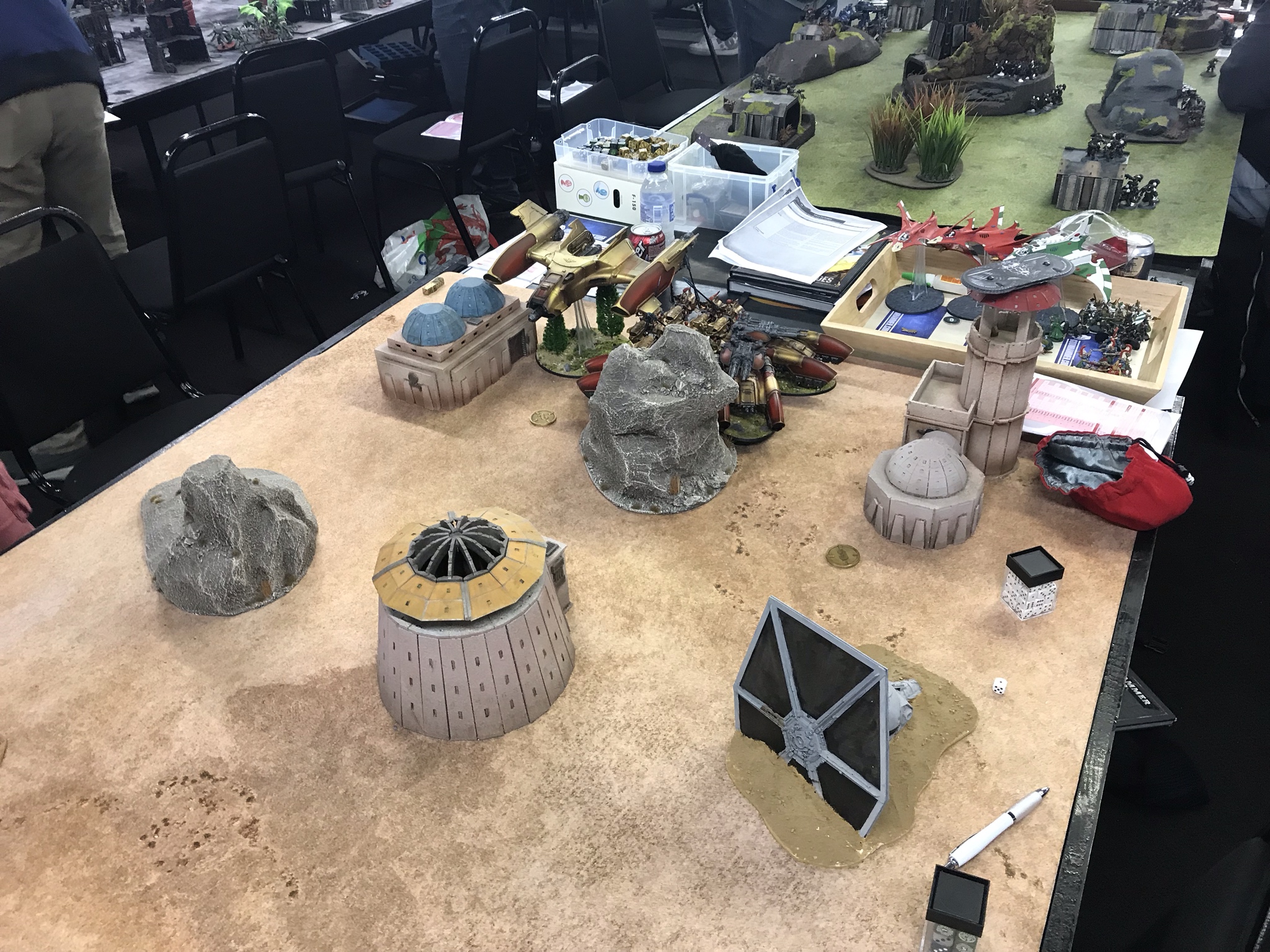 So. Right. Playing Alaitoc at the moment is a real up and down experience, because there's a few armies that, to a greater or lesser extent, no-sell your bullshit defensive gimmick of stacking hit modifiers by being sufficiently accurate that it doesn't stop them deleting you. Custodes are one of them - because they start on BS2+, even at -2 they're hitting way more of the time than is comfortable, and when blaze cannons are involved those hits almost always turn into wounds, and take a huge chunk out of us. They're also long ranged and mounted on fast platforms that ignore move/shoot penalties. All this adds up to a problem - if I start my planes on the board and this list goes first against me, I won't have planes any more, and then I won't be able to kill their stuff. This is a "roll off" first turn mission, but he massively under-drops me, so he's going to take the first turn more often than not.