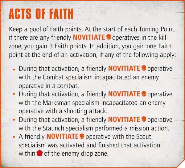 - Faithful Blessing - For a single Faith point get a reroll when you fight in a combat or shoot. This can be used more than once in an activation, combined with another Act of Faith, and is likely to replace command rerolls for Novitiates.