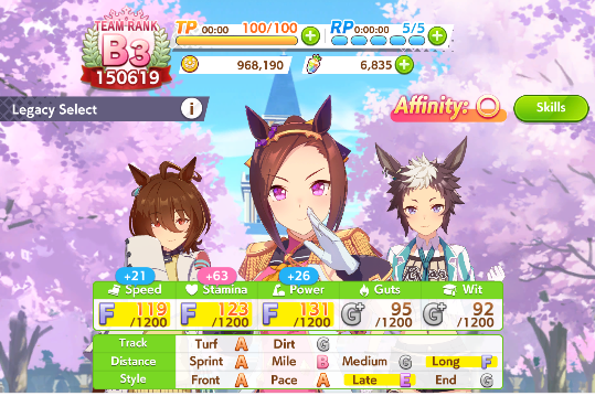 The two most important stats for Sprint are Speed and Power. While guides will often talk about Speed and Stamina, Power is slightly misunderstood due to what it actually does. Power affects your trainee’s acceleration, meaning that the top Speed your racer can reach is directly impacted by how much Power they have to fuel that surge. This matters less in longer races, to the point that training Power in Long Distance races is almost an afterthought, because the longer the race, the more time your racer has to reach their top speed. But in a Sprint, that isn’t the case, and if you’ve ever wondered why your 1200 Speed Sakura Bakushin O is losing to a 1000 Speed 1000 Power King Halo, the answer is that it doesn’t matter how fast you are if you aren’t able to reach that speed in time. Raising a high Speed, High Power Sprinter is actually harder than it may seem, because while Speed trains Power, it doesn’t always train it particularly well, and thus some level of investment needs to be made. And, well, you still need Wit and Stamina, so how do we get to the targets we want? Inheritances and Support Decks.